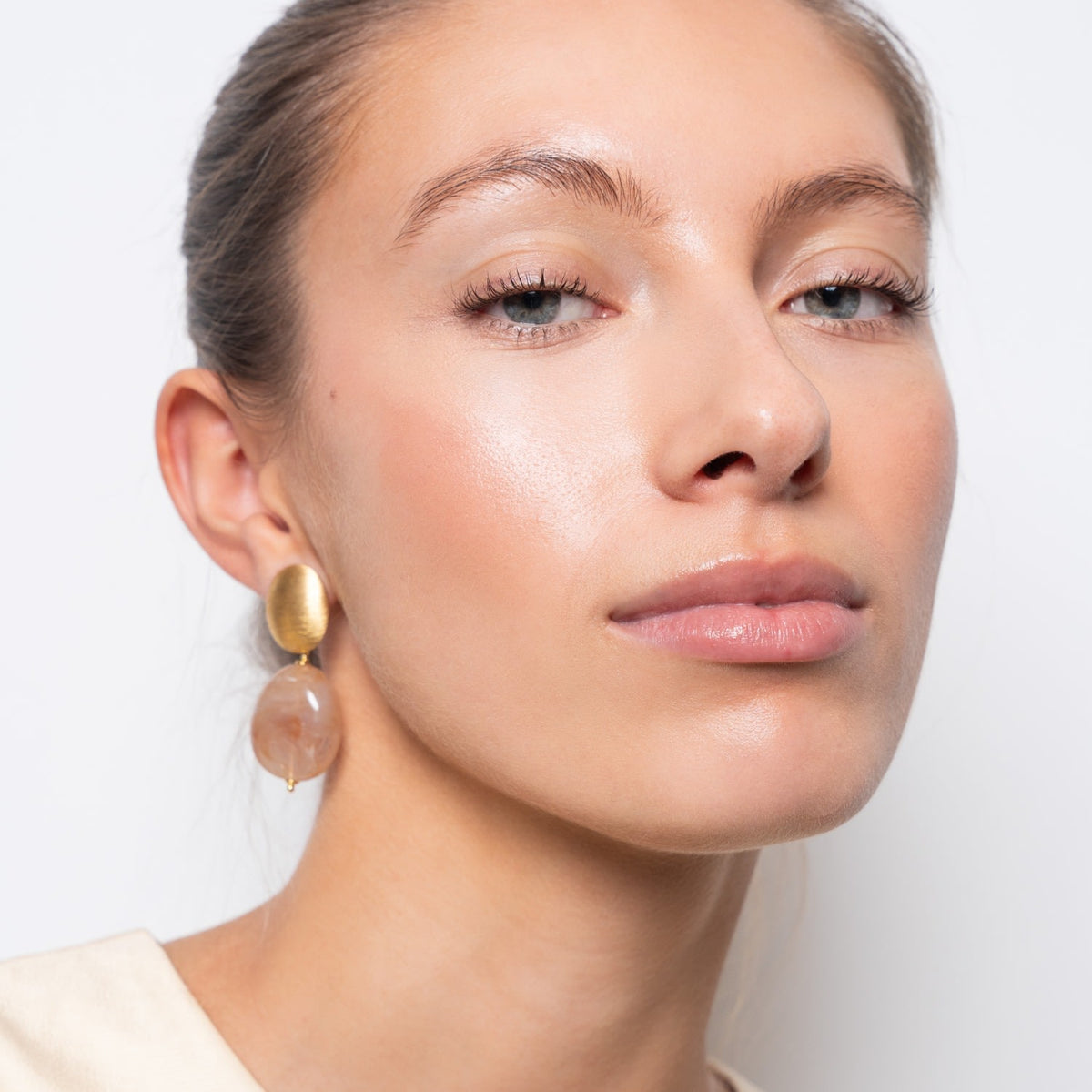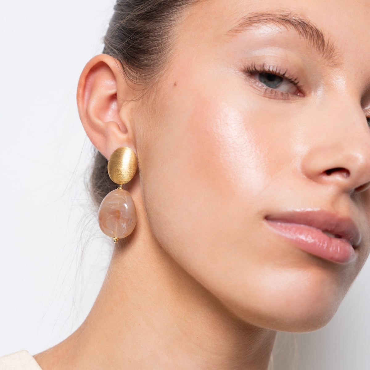 These Natural Mix Earrings Amber Squeezed Drop by Lott. Gioielli make a bold and refined impression. They feature a warm-toned, amber-like drop with delicate marbled swirls, complemented by a brushed gold stud. Lightweight and comfortable, they are perfect for both special occasions and everyday elegance.