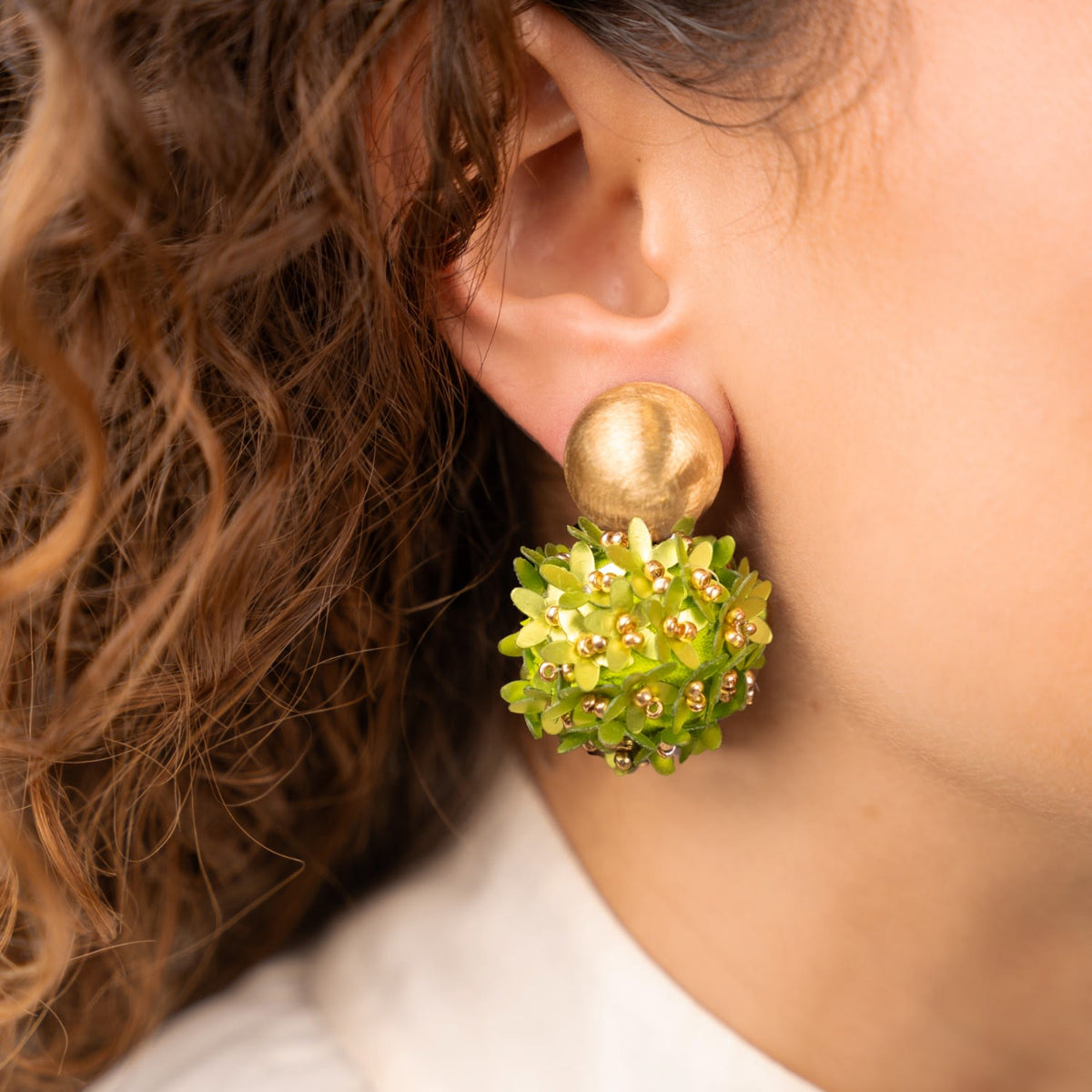 These Lime Earrings Daisy Flower Globe M by Lott. Gioielli are a fresh and playful statement accessory. Rendered in a vibrant lime hue and adorned with shimmering sequin flower elements, they bring a touch of playful elegance to any look. The sophisticated design and sparkling finish create a luxurious yet subtle presence, making them a must-have addition to your collection for a fun and stylish aesthetic.