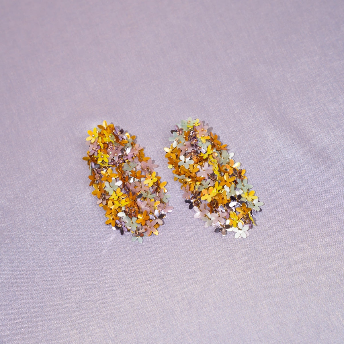 These earrings are gold-plated and feature floral motifs with yellow, lavender, and mint-colored sequins. They weigh 8.6 grams.