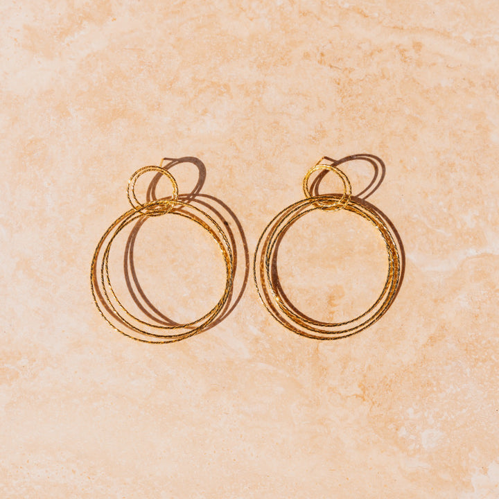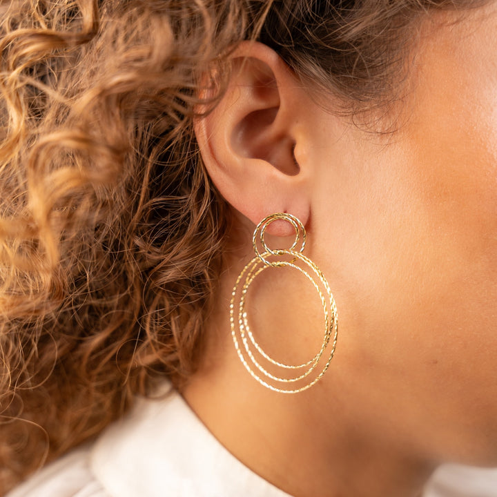 Crafted from gold-plated metal. These are triple hoop earrings.