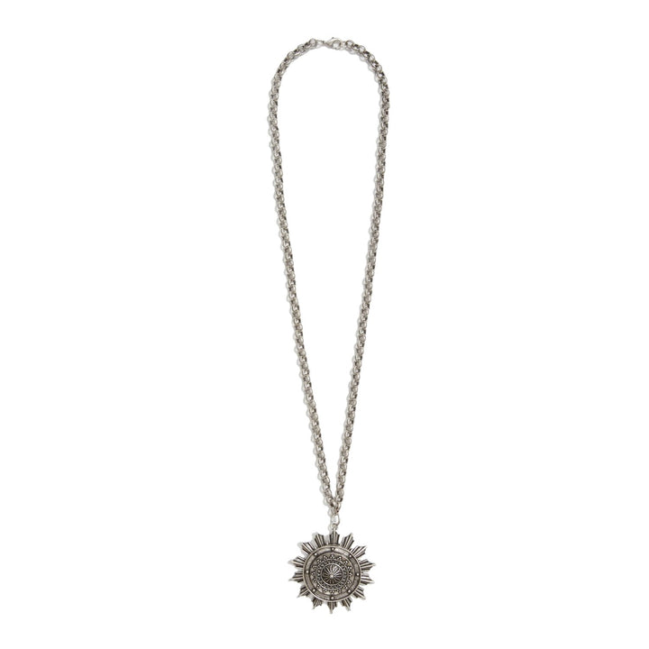 This Medallion Necklace - Silver by Lovard is a stunning look sure to turn heads. The necklace features a thick chain and a round circle medallion charm with a sun-burst design. It's a bold and beautiful piece that adds a touch of classic elegance to your look.