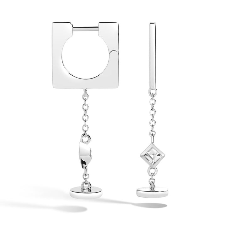 The A Dream, Aloud Earrings by Lúdere are unique and beautiful sterling silver hoop earrings with a cable chain drop. They are set with white topaz gemstones and a hanging charm. These earrings are designed to inspire you to embrace your authentic self, making them perfect for both everyday wear and special occasions.