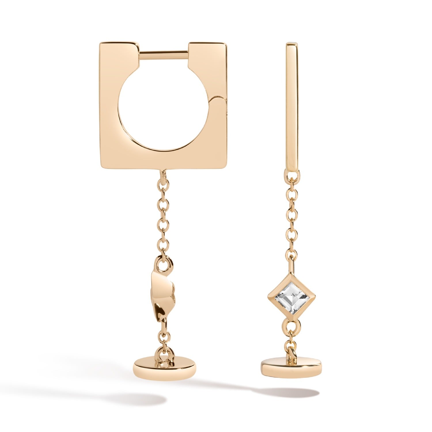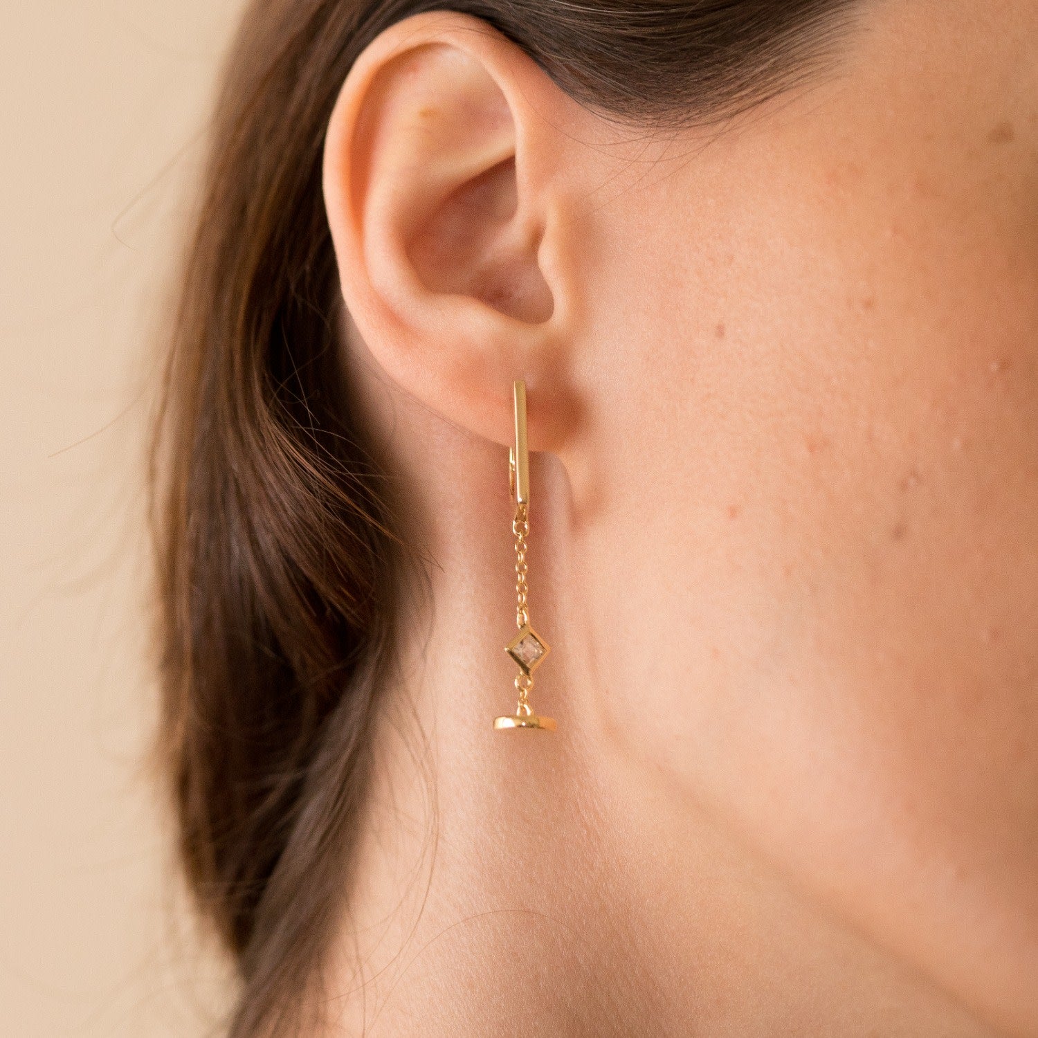 The "A Dream, Aloud" Earrings by Lúdere are a unique and beautiful accessory. These hoop earrings feature a cable chain drop and are adorned with white topaz gemstones and a charming hanging charm. Made with a thick layer of 18K yellow gold over sterling silver, they are hypoallergenic and do not tarnish. These earrings are perfect for those who want to express their authentic self and live life with a playful spirit.