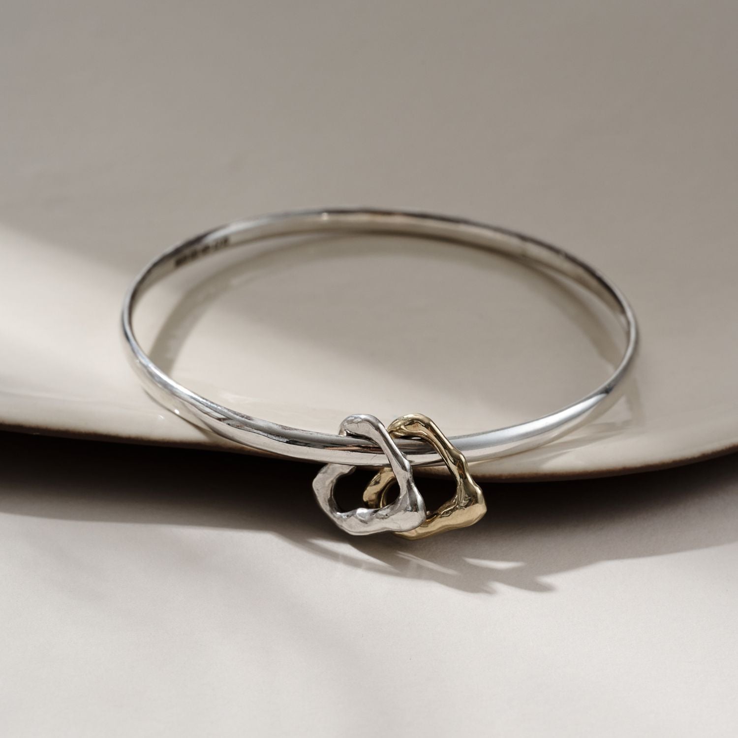 Solid Sterling Silver Charm Bangle With Nine Carat Gold And Sterling Silver Molten Hearts