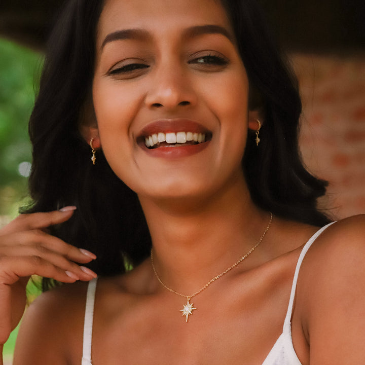 The North Star Gift Set - Earrings & Necklace - Gold Plated by Luna Charles is a stunning and thoughtful gift set. It includes the bestselling North Star Pendant Necklace and Neve Opal Huggie Earrings. Both pieces are made of 18k Gold Plated Brass and feature White Zircon and an Opal colored stone.