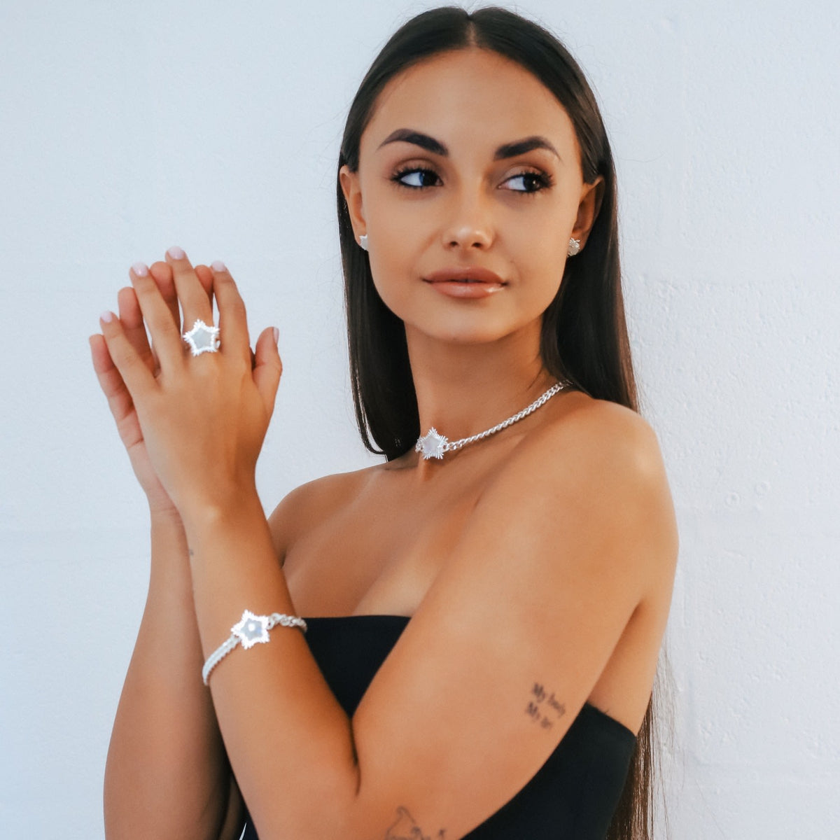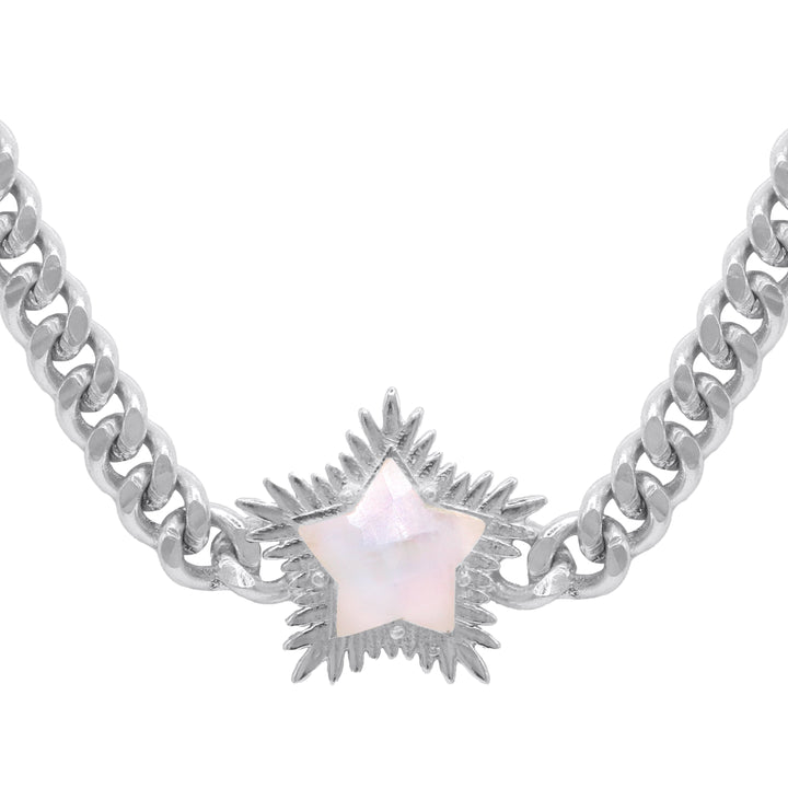 This choker necklace is crafted from 925 sterling silver-plated brass and features a natural moonstone star.