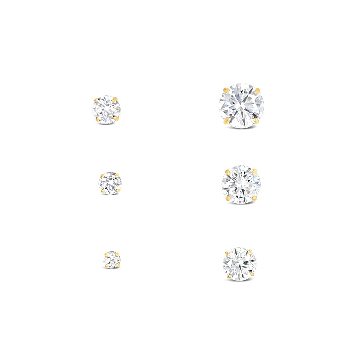 These earrings are crafted from 10K gold and feature 3mm round-cut cubic zirconia. They are also available in 10k white gold.