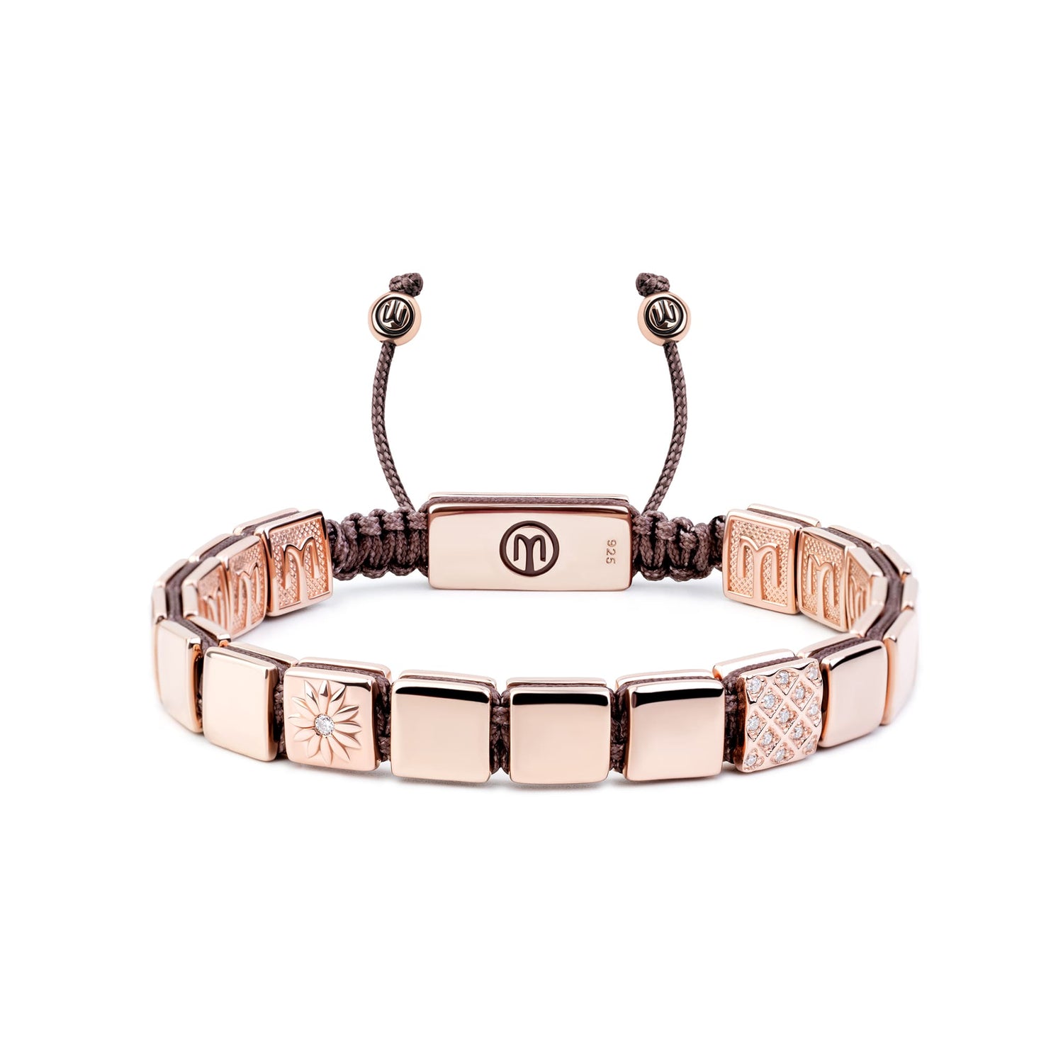 This unisex bracelet features a dark mauve macrame braid with 7x7mm sterling silver 925 beads plated in 14k rose gold with a thickness of 1 micron. The beads are set with white moissanite stones.