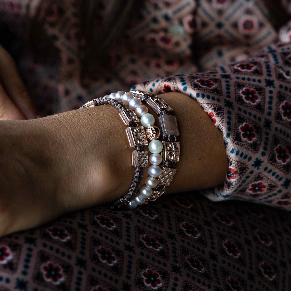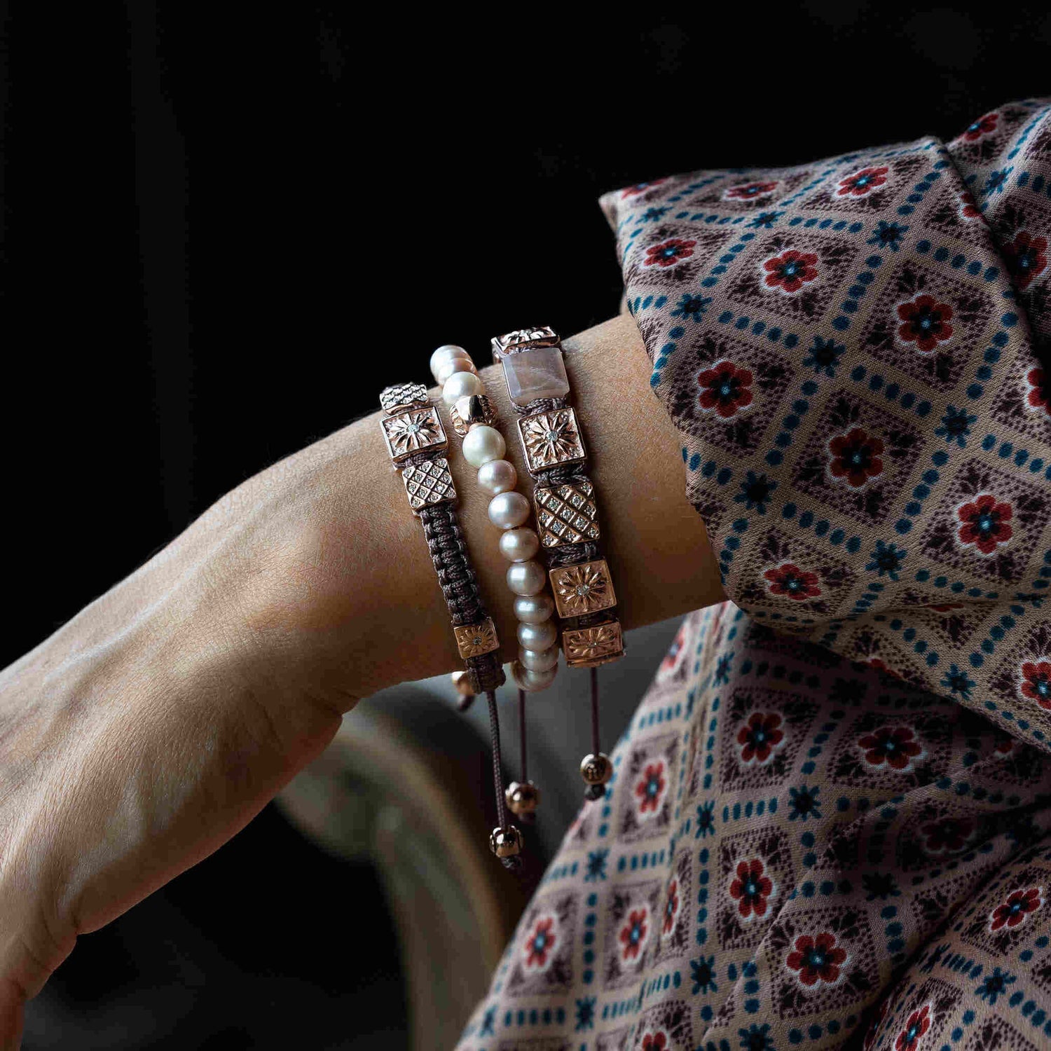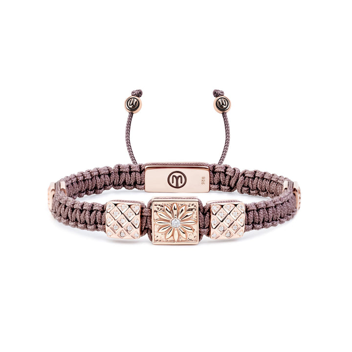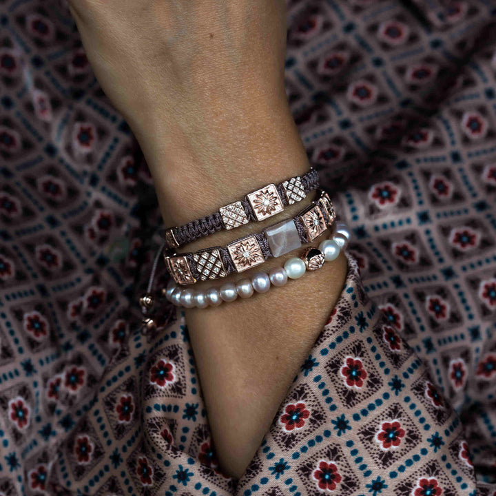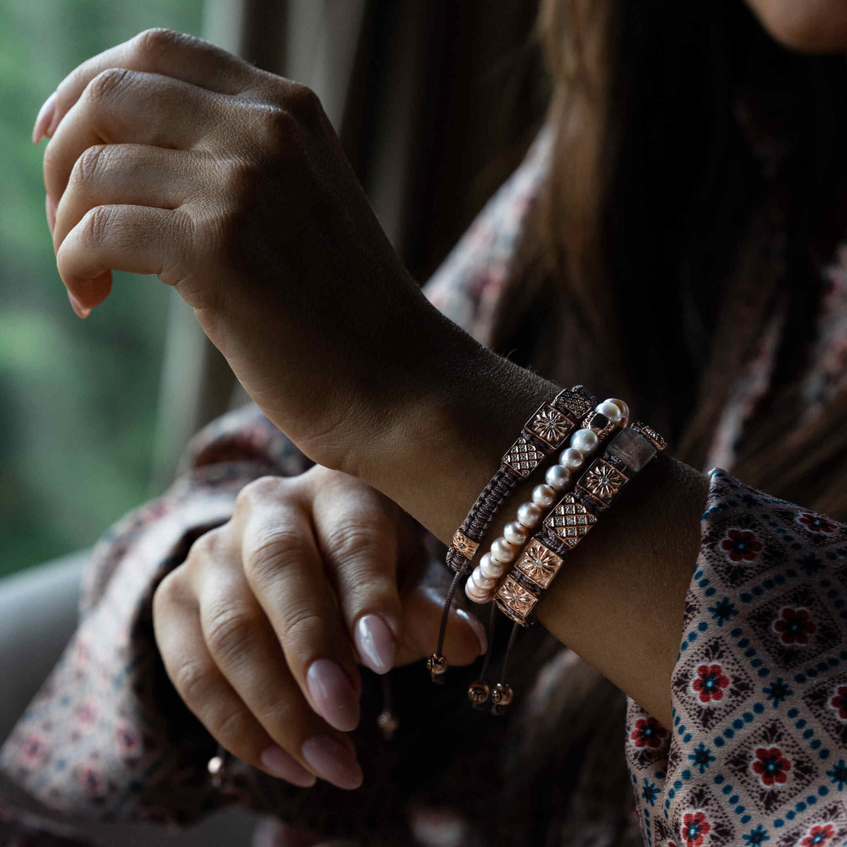 This Triple Macrame Bracelet by Mahigan is a chic unisex accessory. It features three sterling silver 925 beads plated in rose gold and accented with white moissanite stones on a dark mauve macrame string. The combination of the sleek metal, sparkling stones, and braided string gives this bracelet a modern yet earthy feel, perfect for adding a touch of sophisticated style to any look.