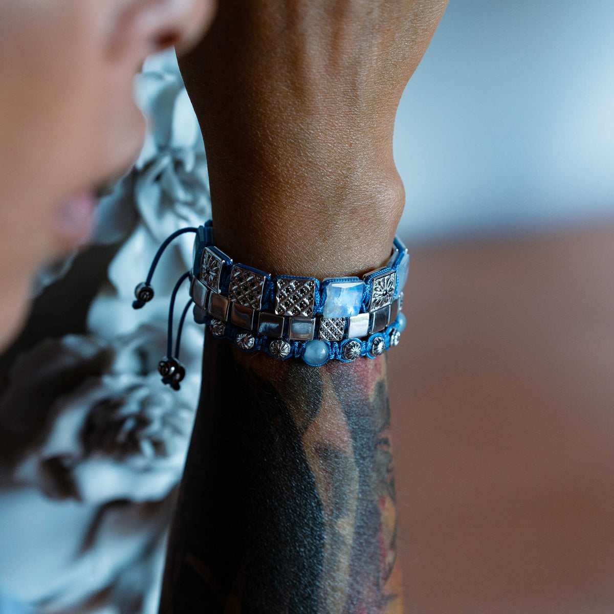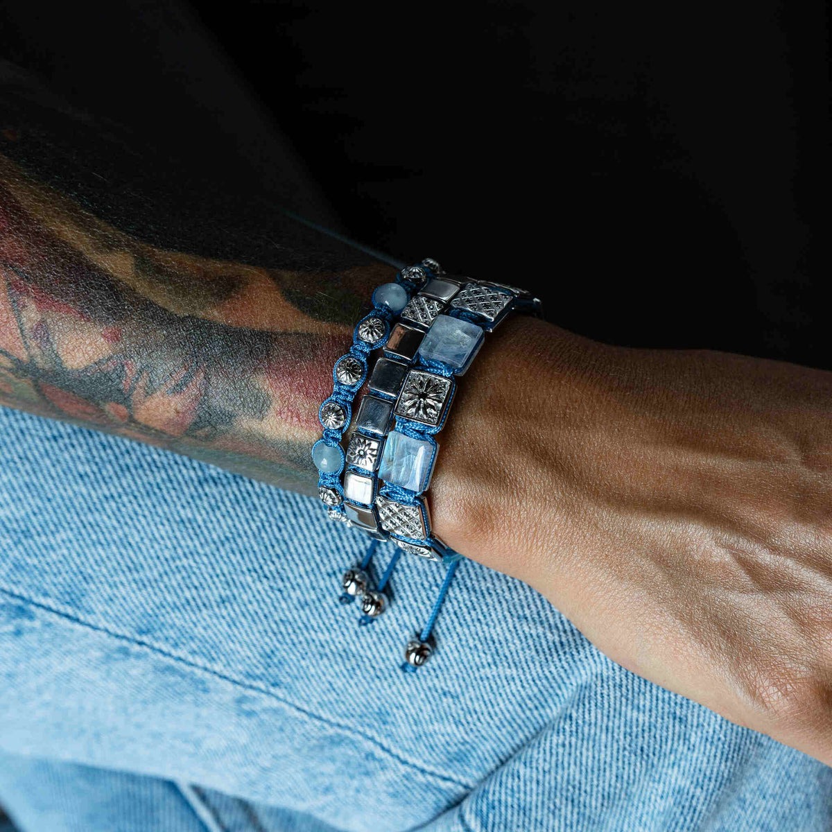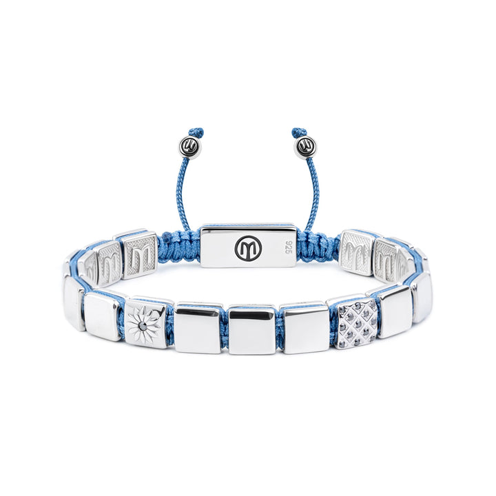 Silver Macrame Bracelet With Black Moissanite & Sky Blue String