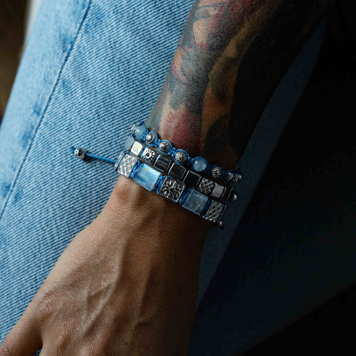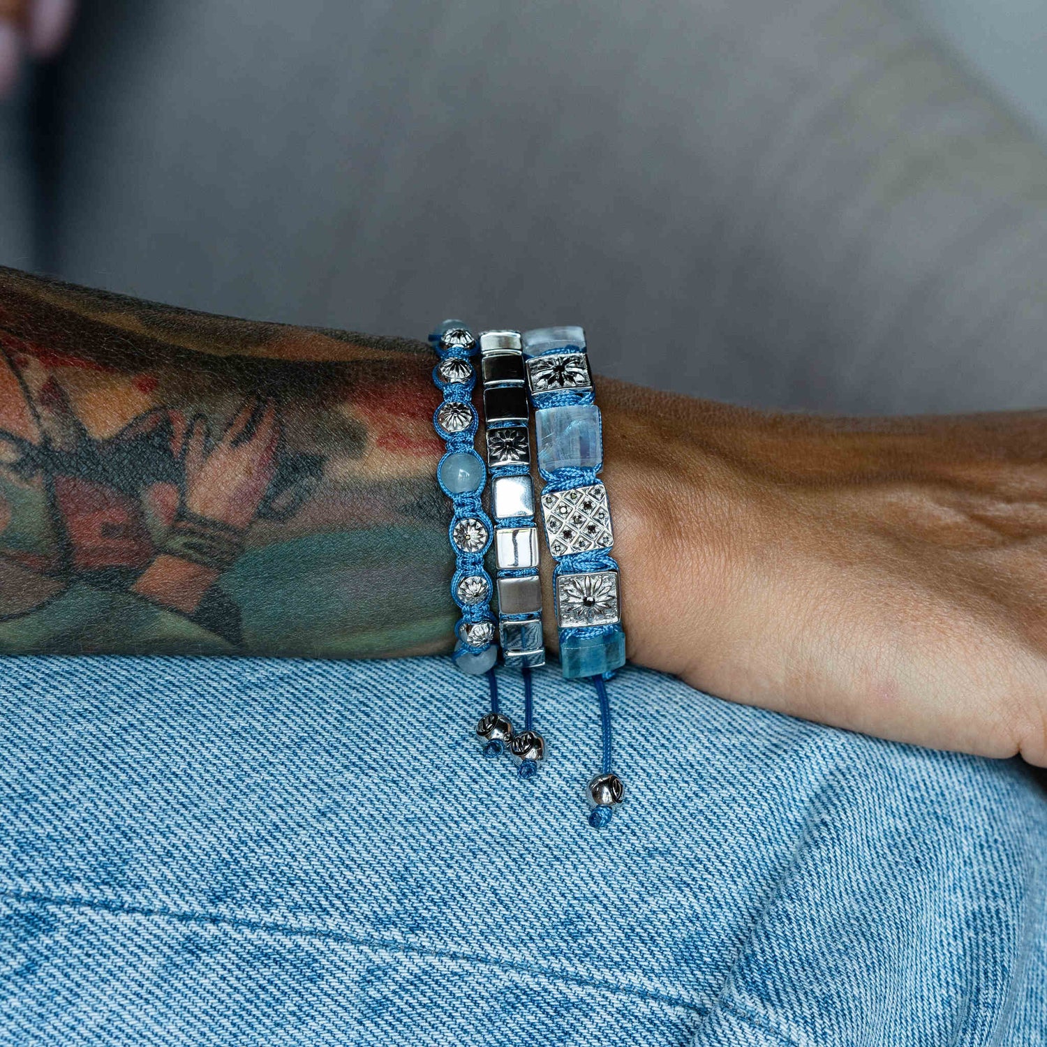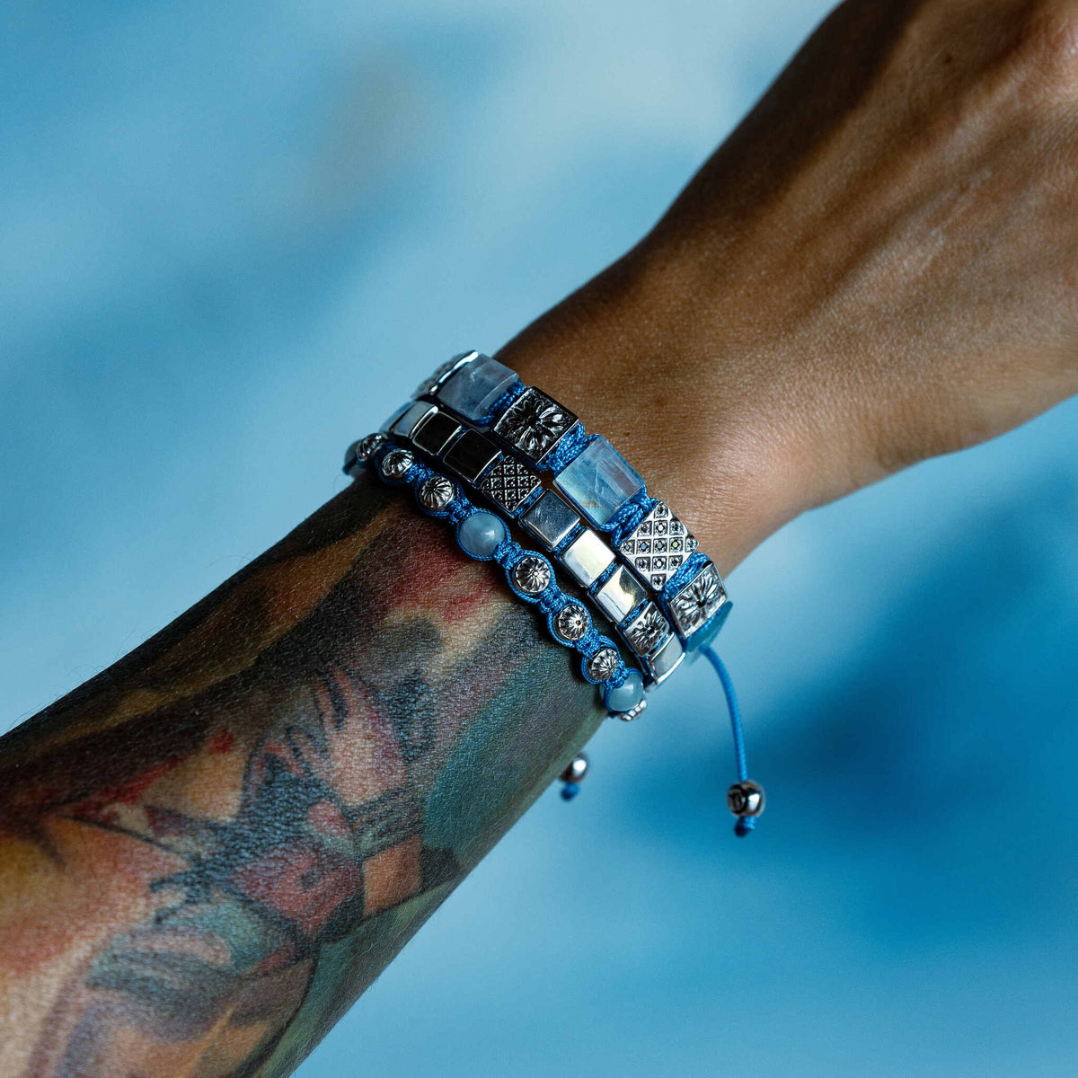 Silver Macrame Bracelet With Black Moissanite & Sky Blue String
