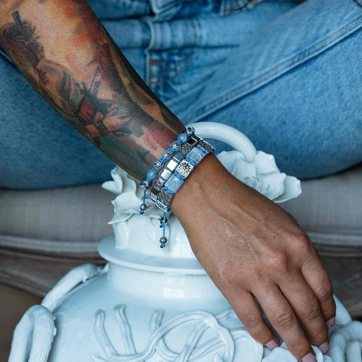 This Silver Macrame Bracelet With Black Moissanite & Sky Blue String by Mahigan is a stylish and versatile unisex piece. The macrame braided design adds a modern, textured touch, while the black moissanite stones provide a subtle, sophisticated sparkle. This bracelet is a one-of-a-kind accessory, perfect for adding a unique detail to any look.