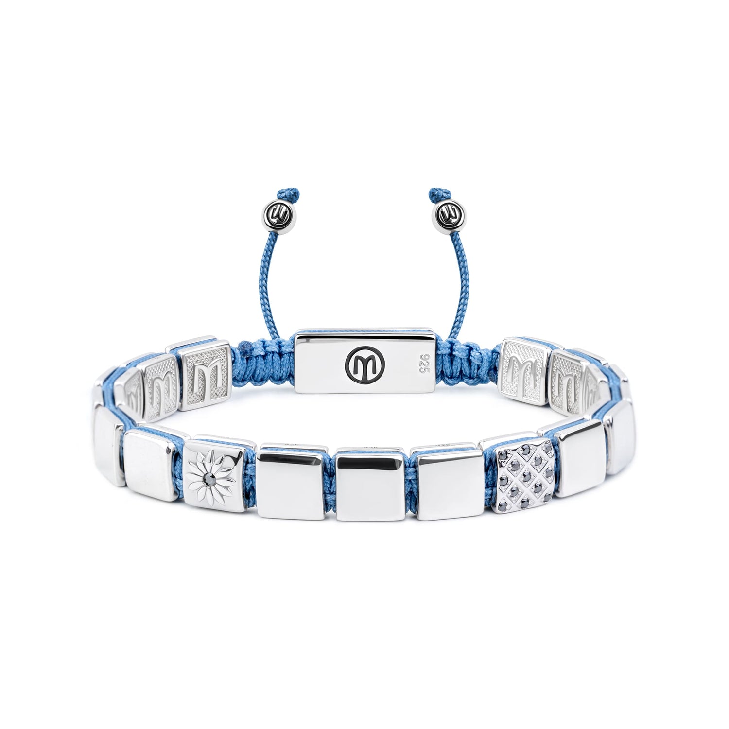 This handmade bracelet features black moissanite stones and a sky blue macrame braided string. The beads are 7x7mm, and the base metal is 925 sterling silver with a white rhodium plating.