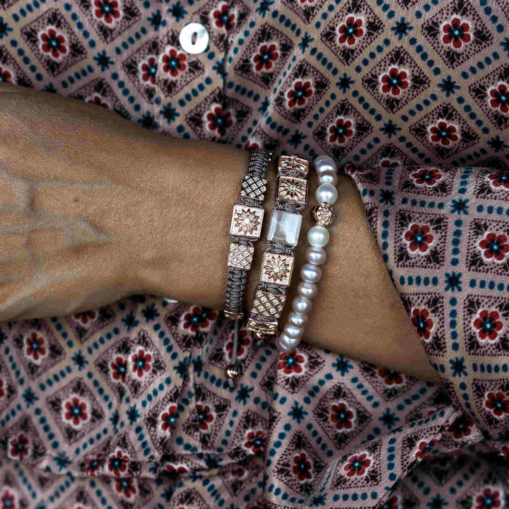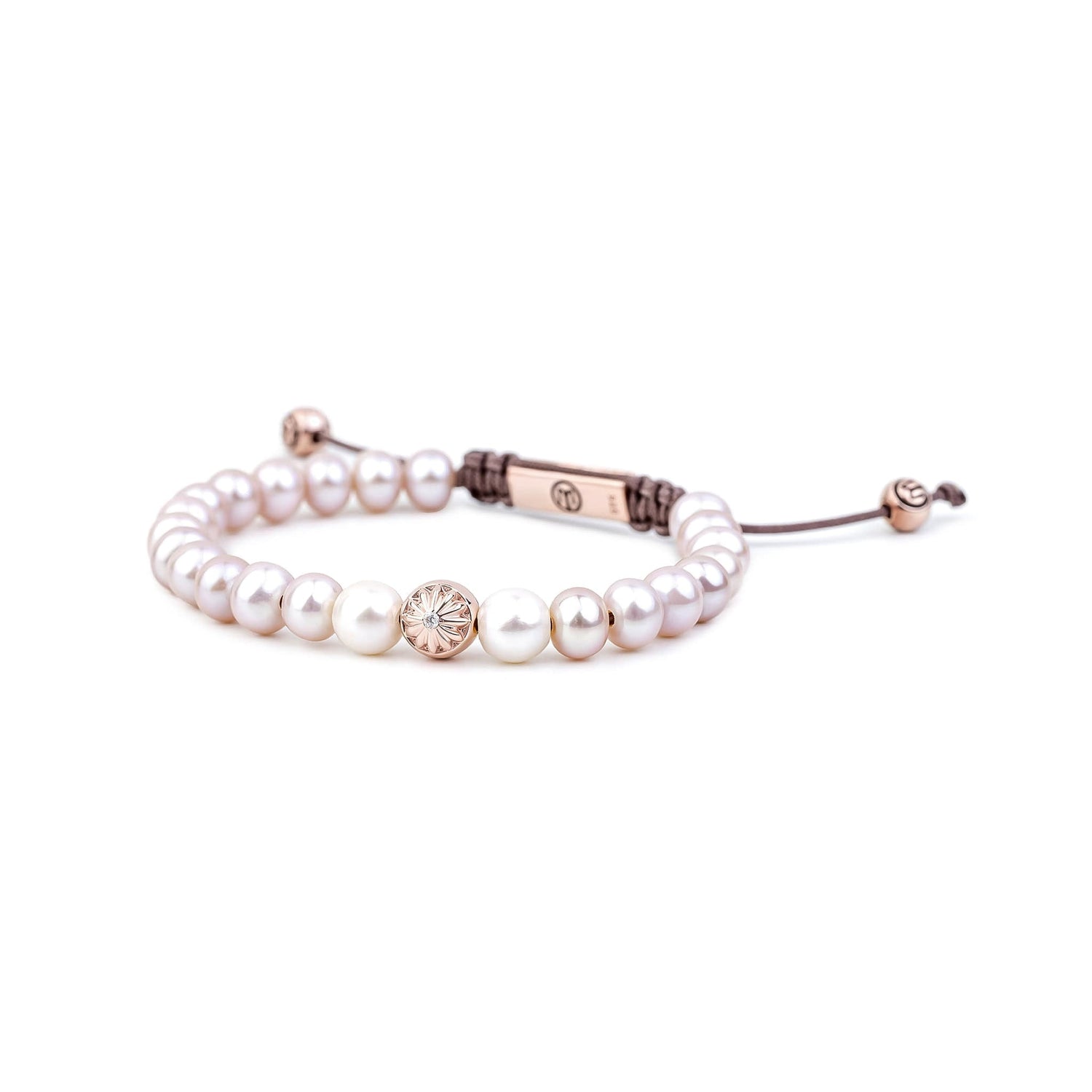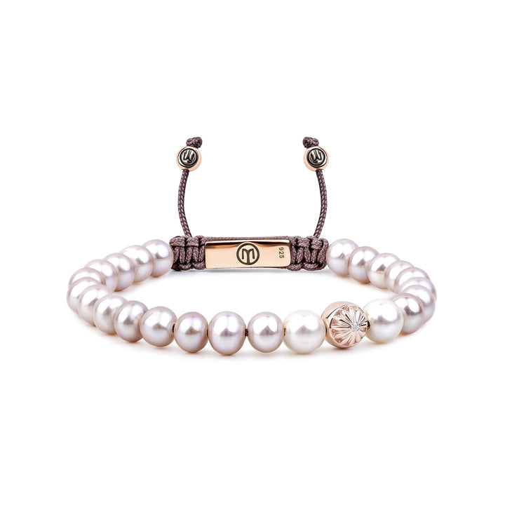 The Lavender Pearl Bracelet In Dark Mauve & Rose Gold by Mahigan is a unique unisex beaded bracelet. It features a combination of lavender and white freshwater pearls with a rose gold-plated bead set with moissanite, all on a dark mauve macramé braided string. This piece is a one-of-a-kind accessory.