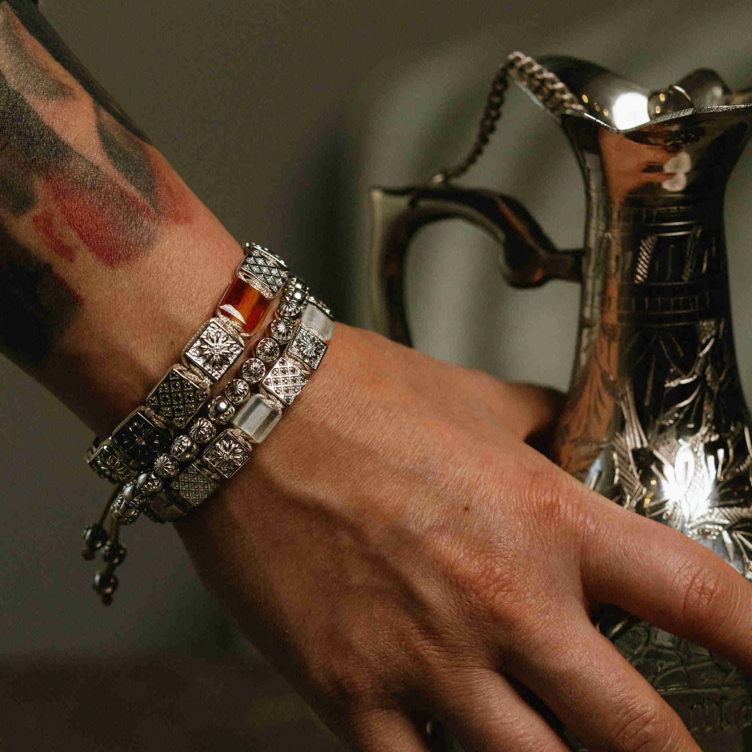 Women's Beaded Bracelet – Silver Beads With Black Moissanites On Beige String