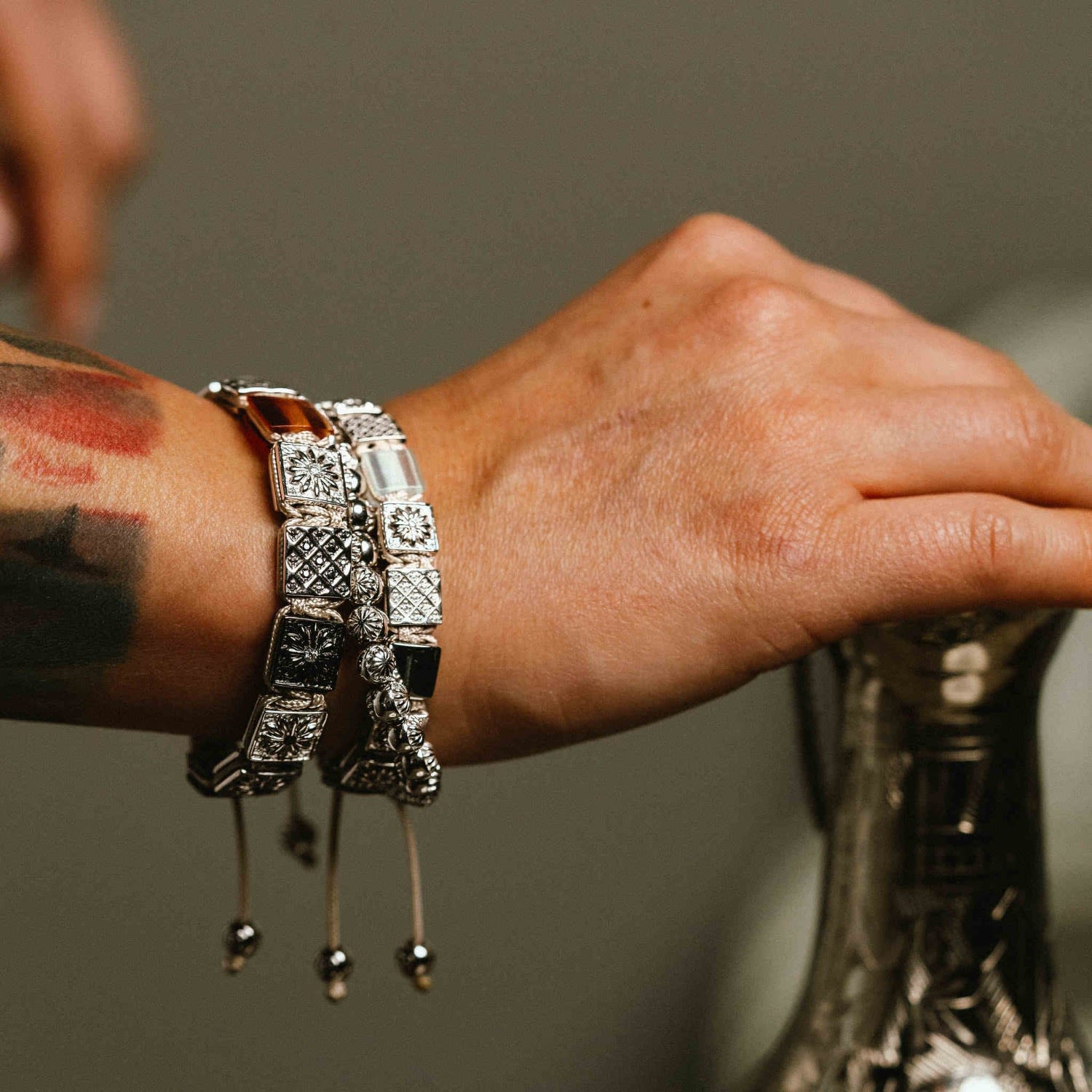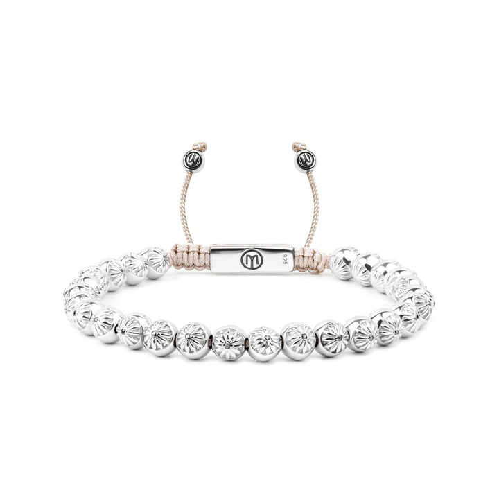 This Women's Beaded Bracelet – Silver Beads With Black Moissanites On Beige String by Mahigan is a stylish and spiritual unisex piece. The beaded, macramé-style bracelet features sterling silver beads set with black moissanites on a beige string. Its handcrafted nature and unique aesthetic make it a perfect, one-of-a-kind accessory for daily wear.
