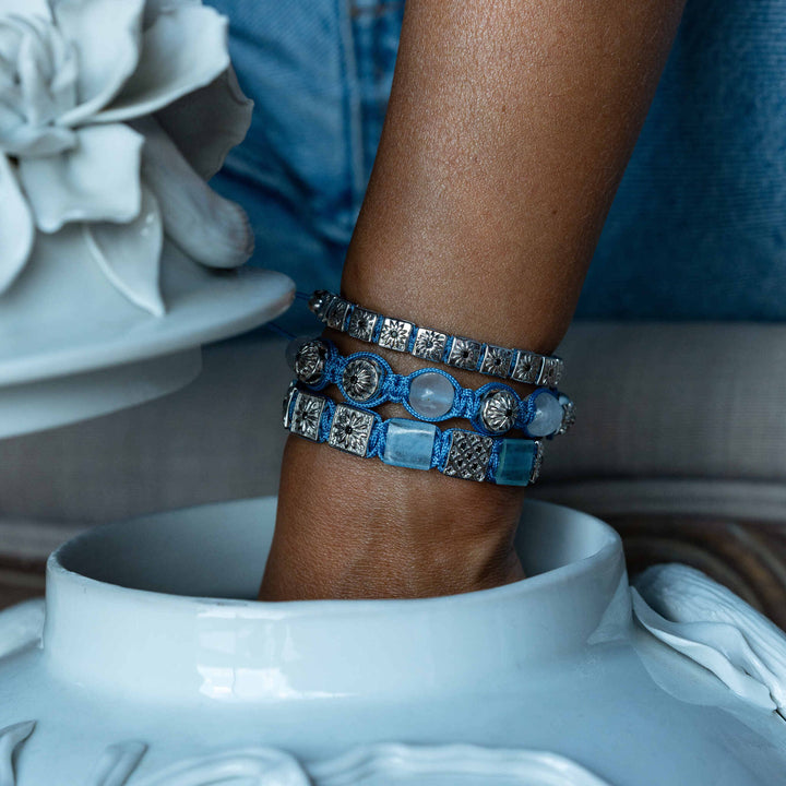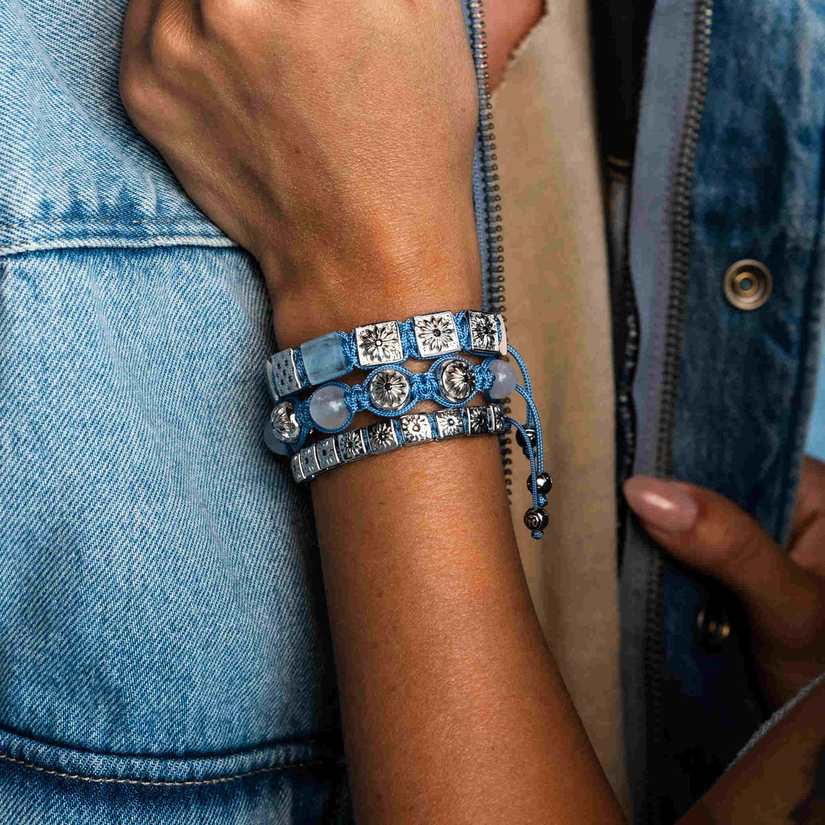 Silver Macrame Bracelet With Black Moissanites & Sky Blue String - The Sun Worshipper