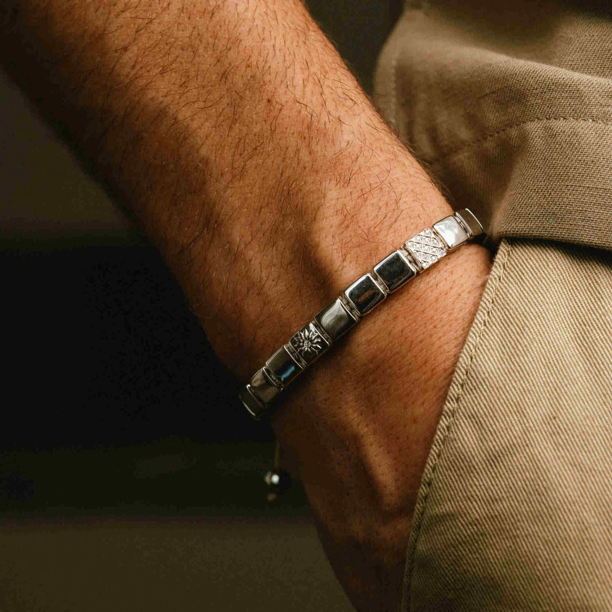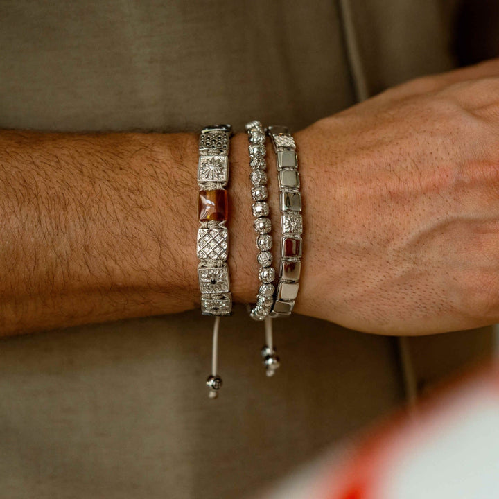 The Women's Silver Macrame Bracelet – Light Beige String With White Moissanites by Mahigan is a unique and stylish unisex accessory. The bracelet features a macrame braided design with a light beige string and a 7x7mm bead of sterling silver 925 plated with white rhodium. The bead is set with white moissanites, making this a truly one-of-a-kind piece.