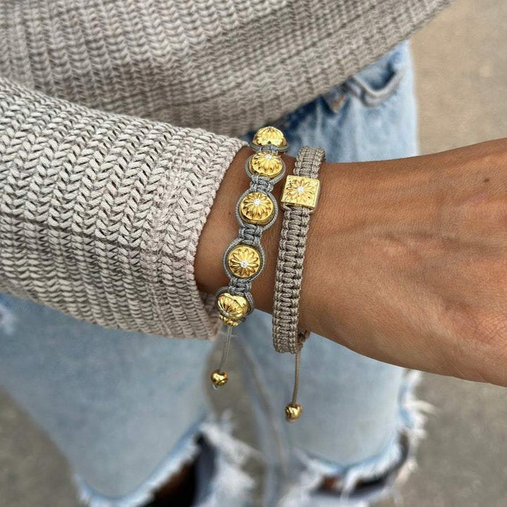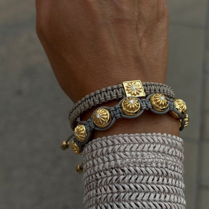 This bracelet is handcrafted from sterling silver 925, featuring a 1-micron 14k gold plating. It includes a 10 x 10mm bead and a 0.015ct white moissanite stone on a beige macramé braided string.