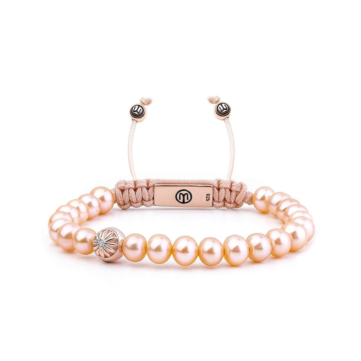 The Pink Pearl Beaded Bracelet In Rose Gold - Sakura Sphera by Mahigan is a one-of-a-kind, handmade bracelet. It features a macrame braided design with genuine pink freshwater pearls and a sterling silver bead plated in 14k rose gold, which is set with a white moissanite. The pink pearls symbolize love and harmony.