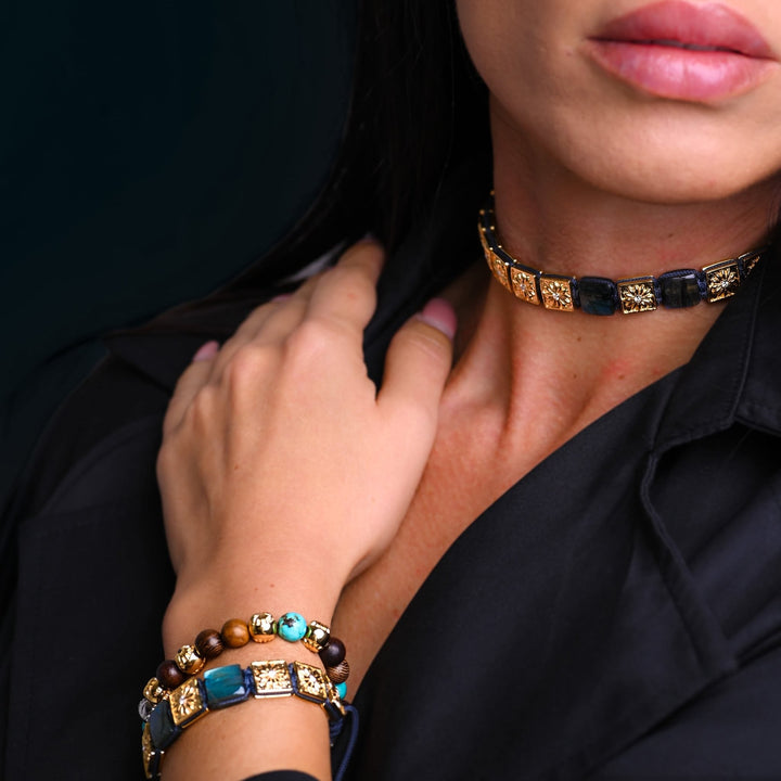 This Macrame Bracelet In Gold With Labradorite & Grey String by Mahigan is a one-of-a-kind unisex piece. The macramé braided design features a powerful labradorite stone, known for its mystical iridescence and for resonating with transformation and self-discovery. The bracelet has sterling silver beads with 14k gold plating, making it a beautiful and meaningful accessory that echoes the spirit of your journey.