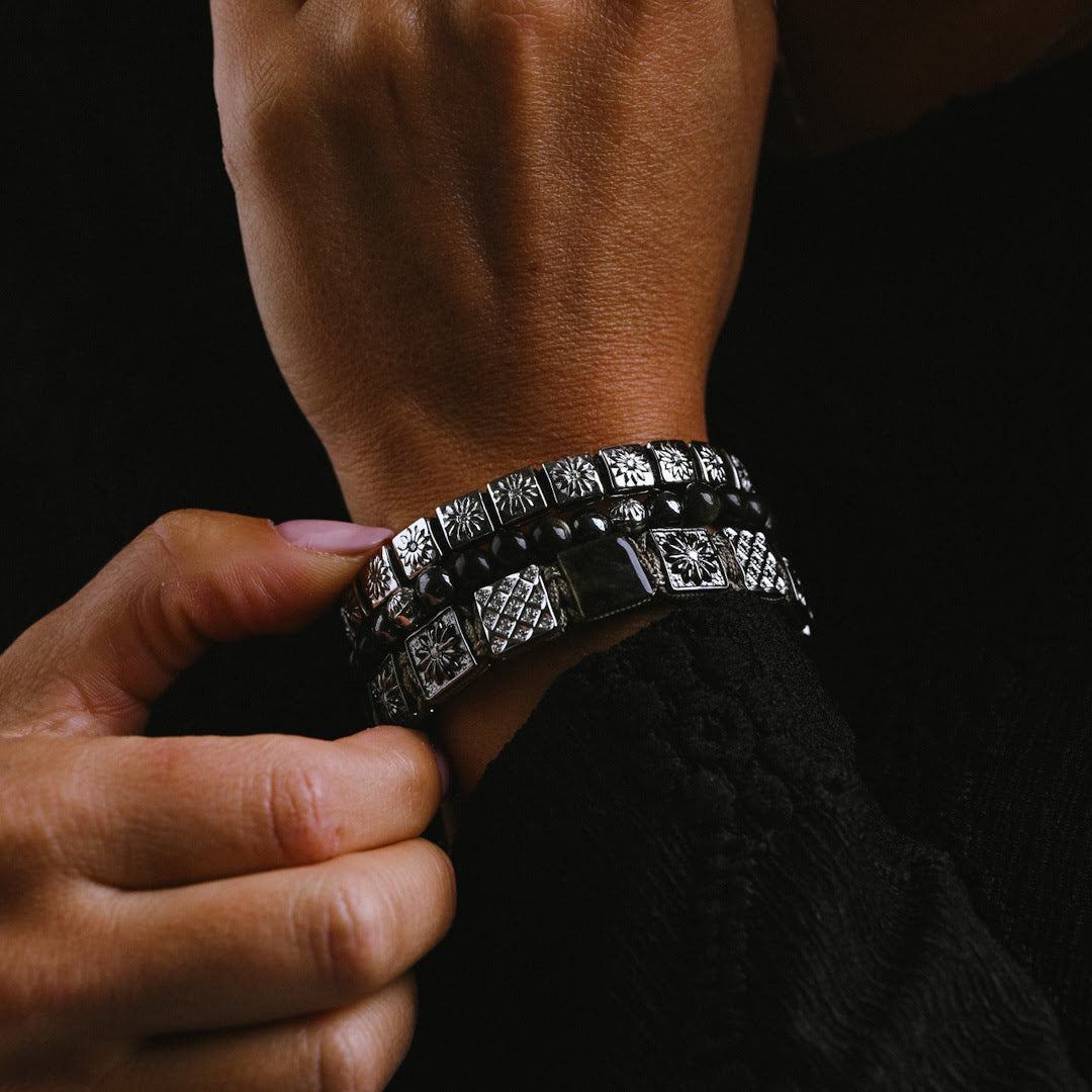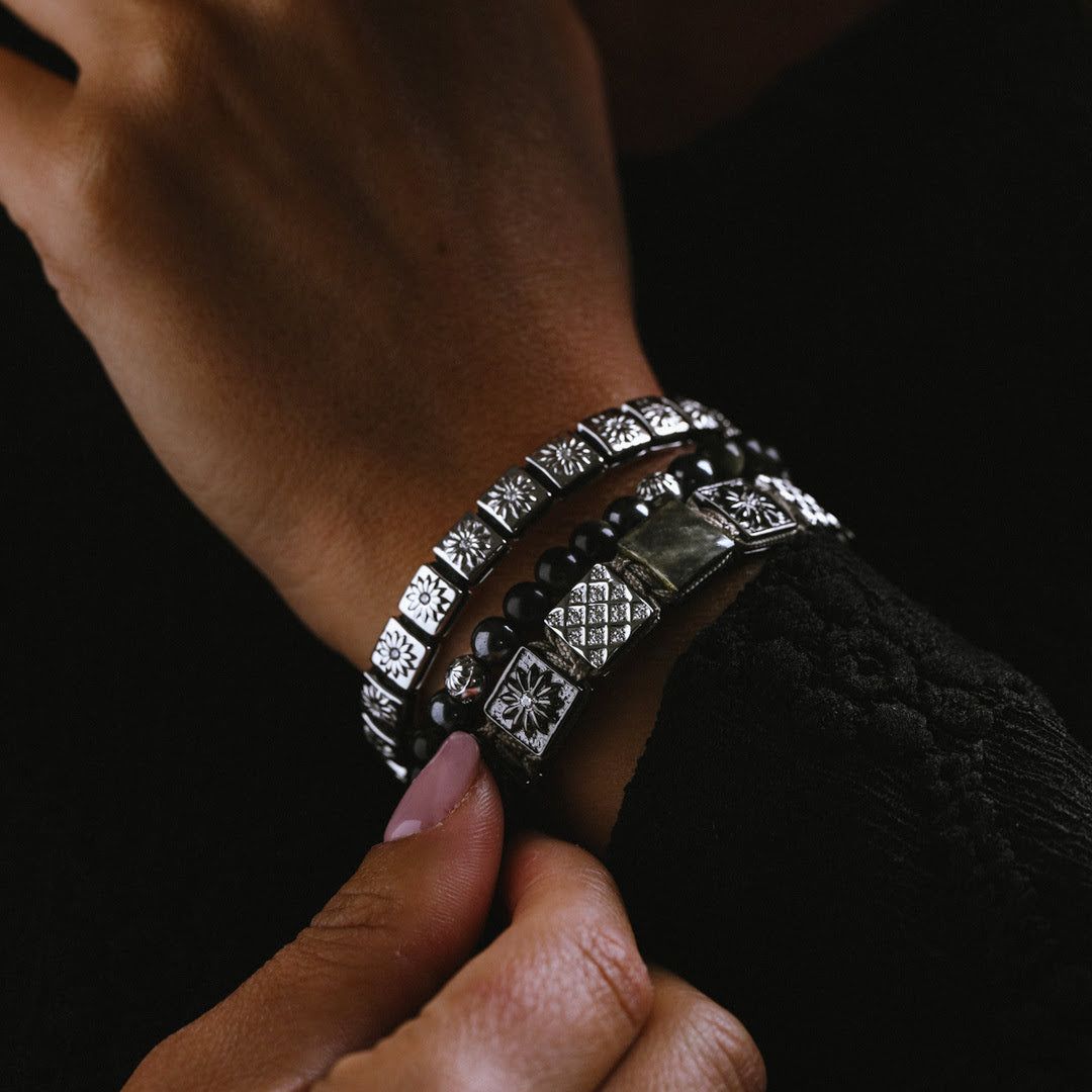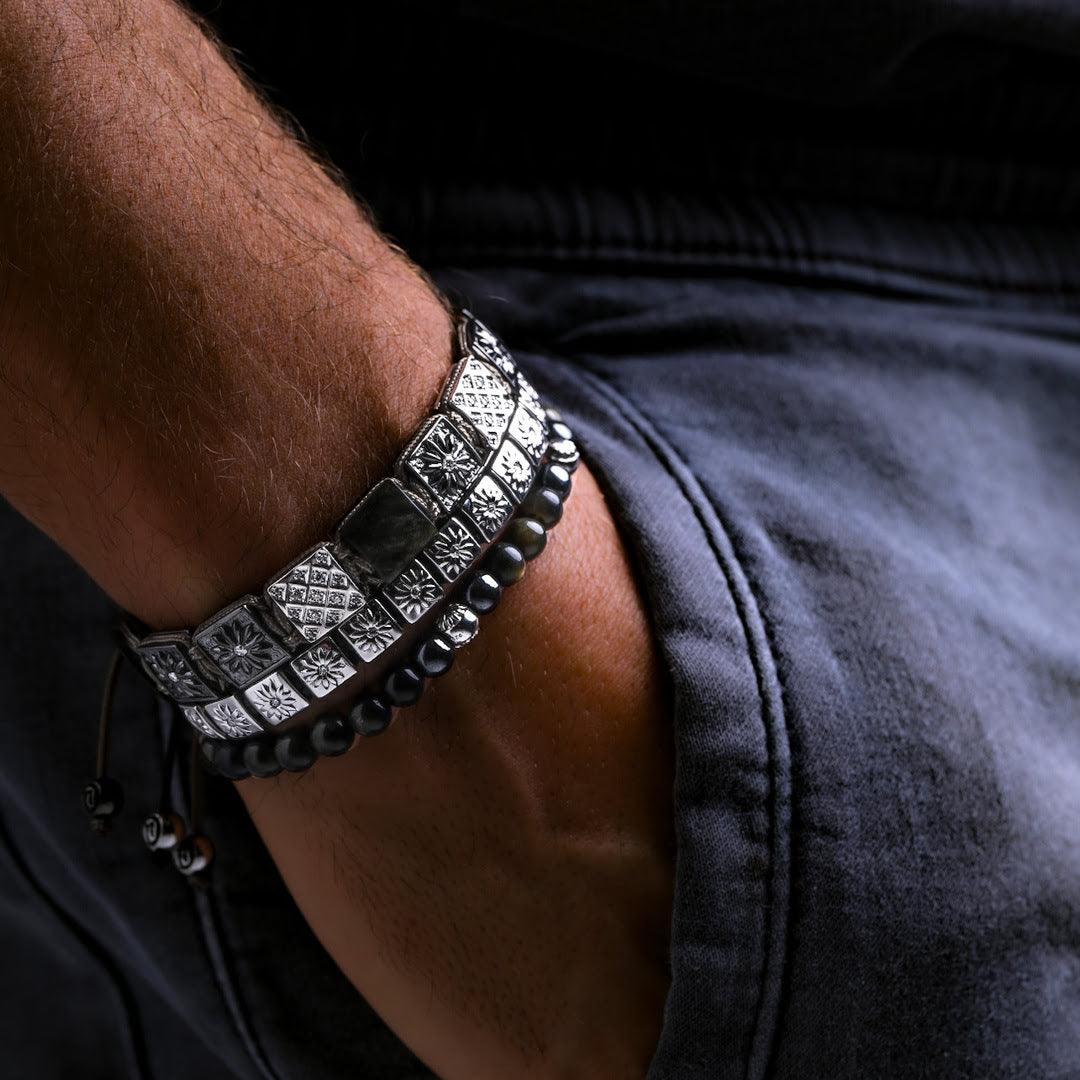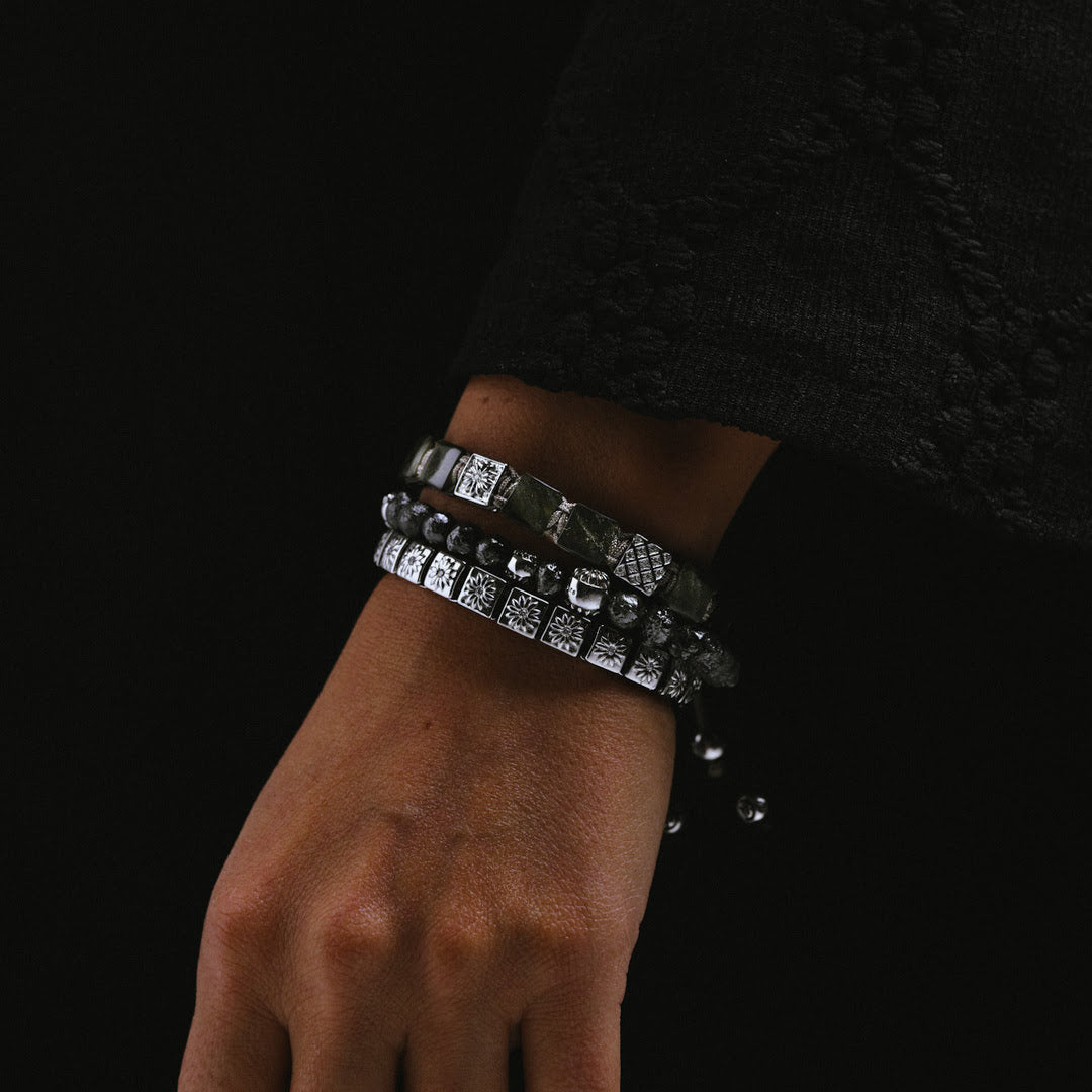 This Flat-Bead Bracelet With Golden Obsidian by Mahigan is a one-of-a-kind, handcrafted unisex piece. The macramé braided design features flat sterling silver beads and a powerful golden obsidian stone. Golden obsidian is a protective stone that shields against negativity, enhances personal power, and promotes insight and clarity. This bracelet is a beautiful and meaningful accessory that aligns with the wearer's inner growth and strength.