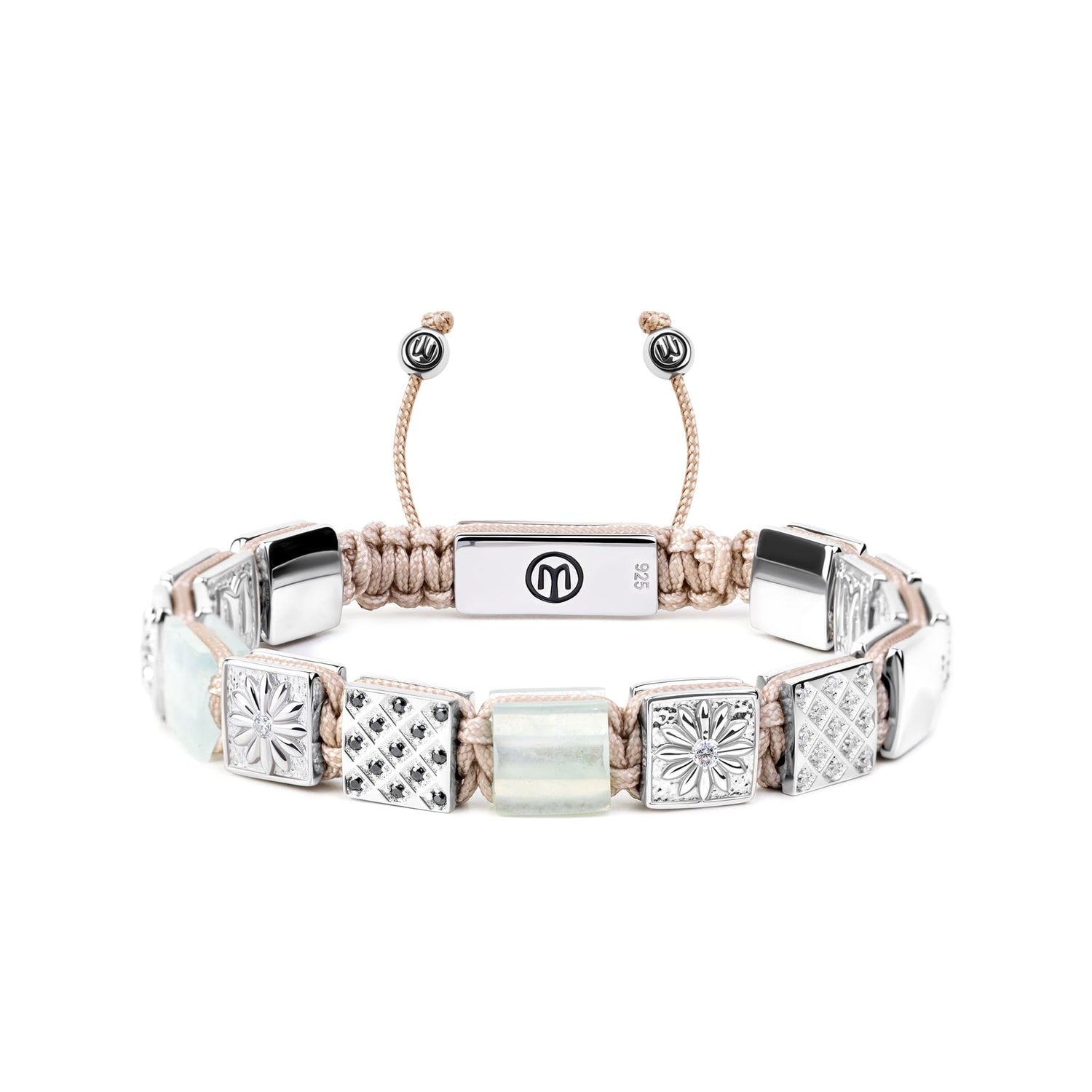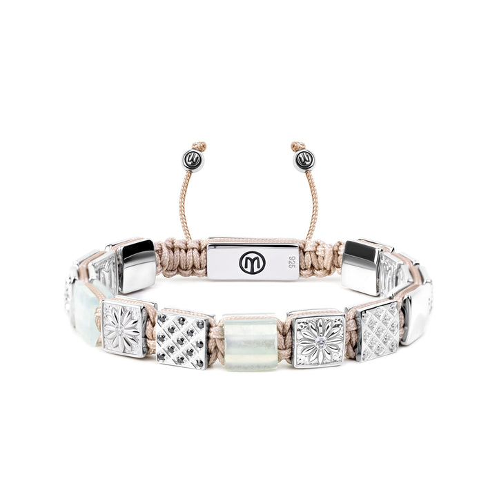 The Flat-Bead Bracelet With Aquamarine & Beige String In Silver is a unisex bracelet with a tranquil and elegant design. It features aquamarine and moissanite stones on a beige macramé cord. The aquamarine symbolizes tranquility and emotional healing, making this a stylish and meaningful piece.
