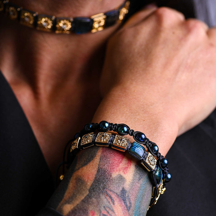 This unisex bracelet is handmade. The base metal is Sterling Silver 925 with a 1.0-micron 14k gold plating. It features four labradorite beads and black moissanites. The string is a dark grey macrame braid.
