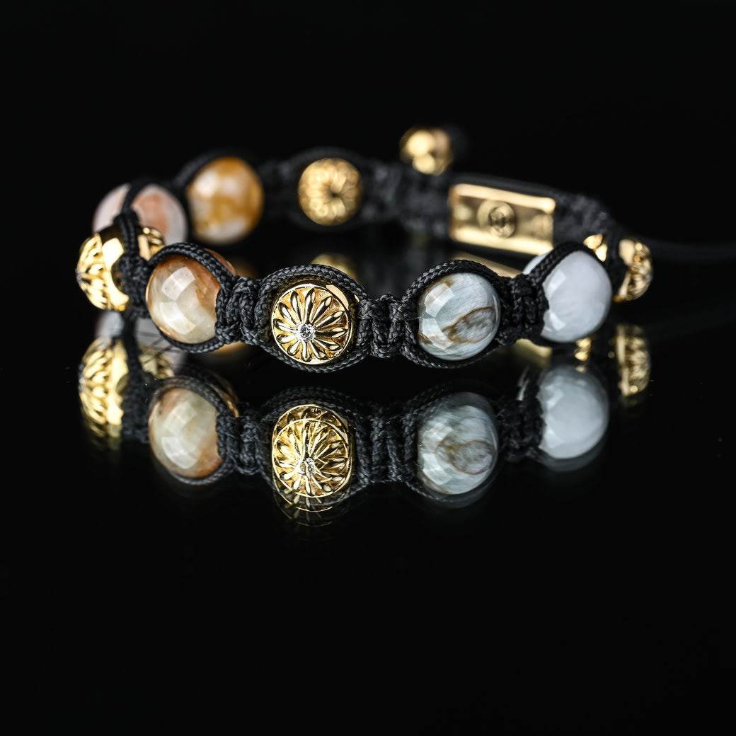 This bracelet is made of Sterling silver 925 and 14k gold plating. The stones are Eagle Eye and Black Moissanite.