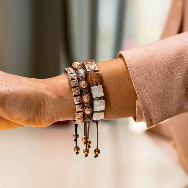 This Mauve Macrame Bracelet With Mother Of Pearl & Peach Moonstone Flat Beads In Rose Gold by Mahigan is a beautifully crafted unisex bracelet that combines calming and nurturing energies. The peach moonstone beads are revered for emotional balance and inner clarity, while the mother-of-pearl fosters tranquility. The intricate macrame braid and elegant stones create a unique, one-of-a-kind piece. This bracelet is a perfect blend of style, spirituality, and thoughtful craftsmanship.