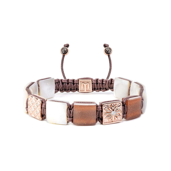 Features a base of sterling silver 925 with 14k rose gold plating (1.0 micron thick). The bracelet has two peach moonstone beads, mother-of-pearl beads, and white moissanites. It is a macrame braided piece with a dark mauve string. Each piece is handmade and one-of-a-kind.