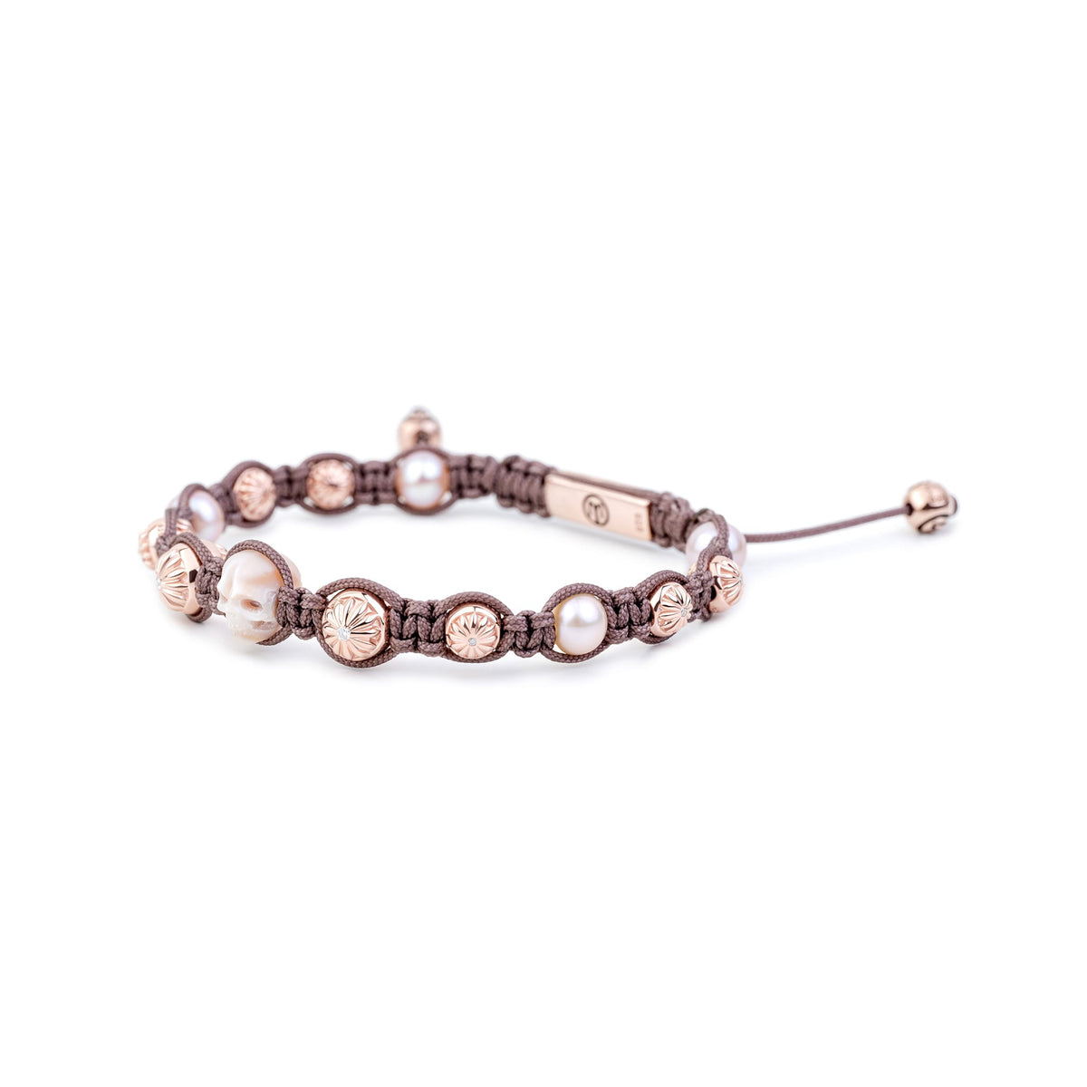 Unisex bracelet made from Sterling Silver 925 with 14k rose gold plating (1.0 micron thickness). It features a pearl-engraved skull, lavender freshwater pearls, moissanite, and is braided with dark mauve macrame string.