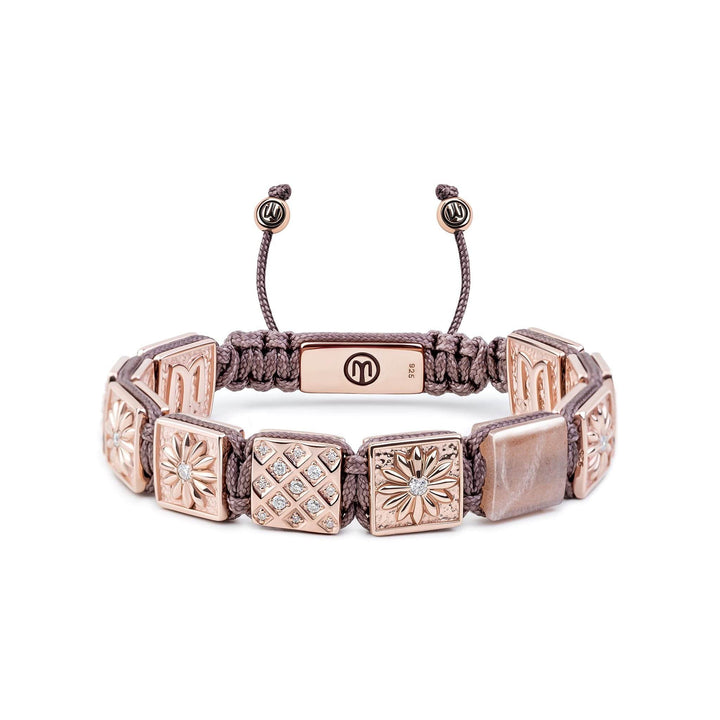 This macrame bracelet is made with a sterling silver 925 base metal, which is plated with a 1.0-micron layer of 14k rose gold. It features a 10x10mm peach moonstone bead and white moissanites, with a total carat weight of 0.03ct each. The string is a dark mauve color. The piece is nickel-free.