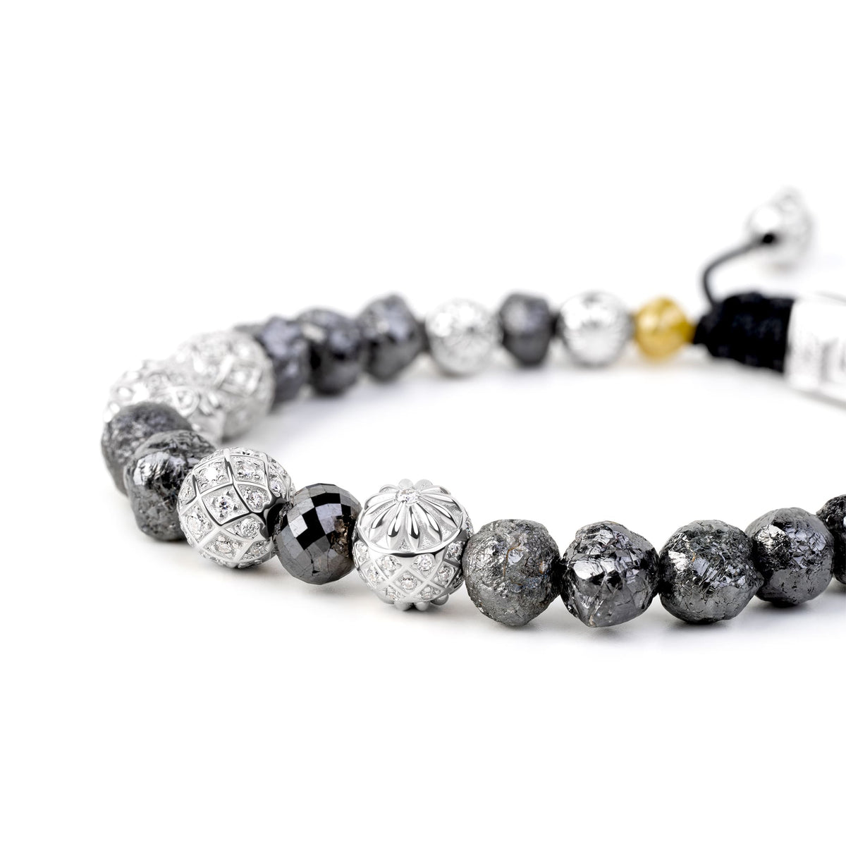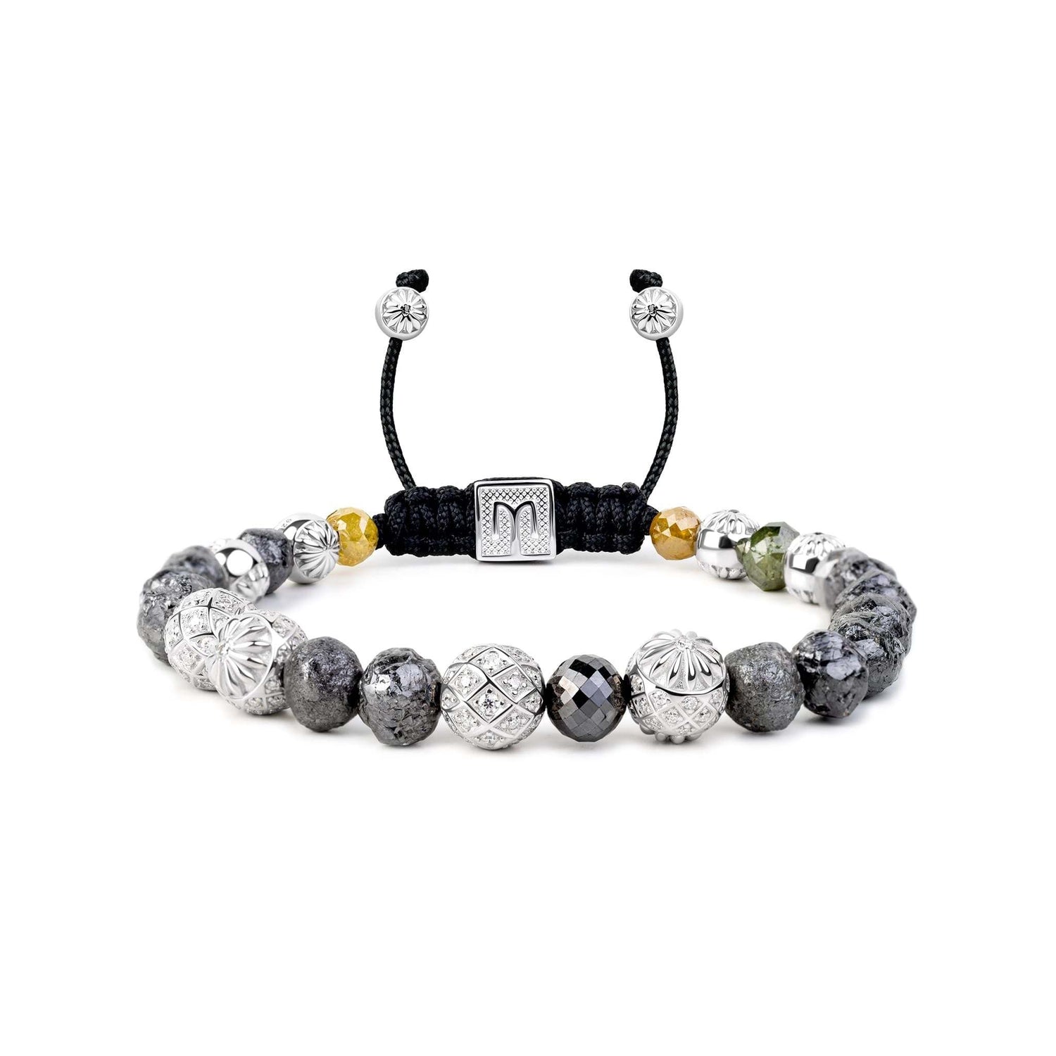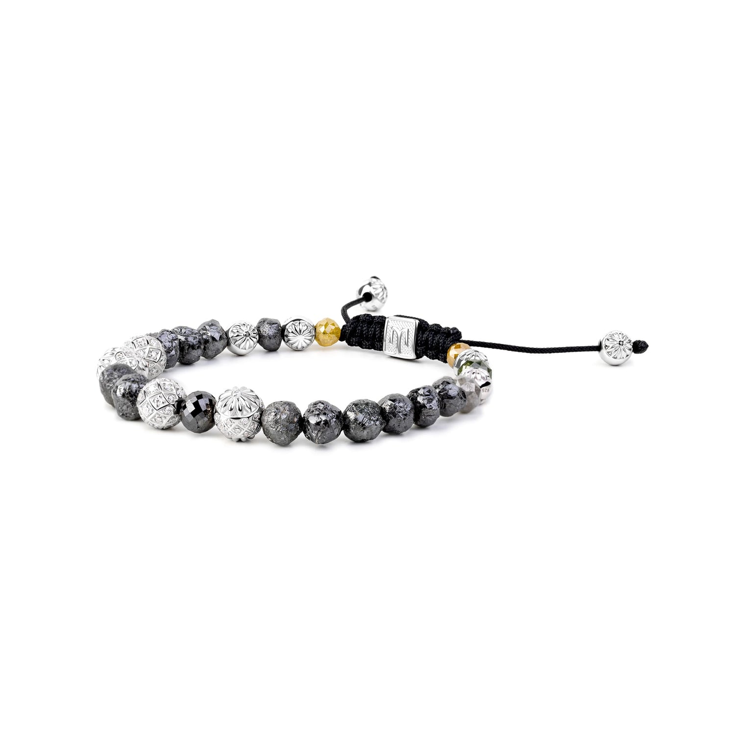 This unisex beaded bracelet is crafted on a black string with a 925 sterling silver base and white rhodium plating. It features raw and faceted natural black, yellow, green, and gray diamonds, as well as white and black moissanite. The approximate total carat weight is 33.35 carats.