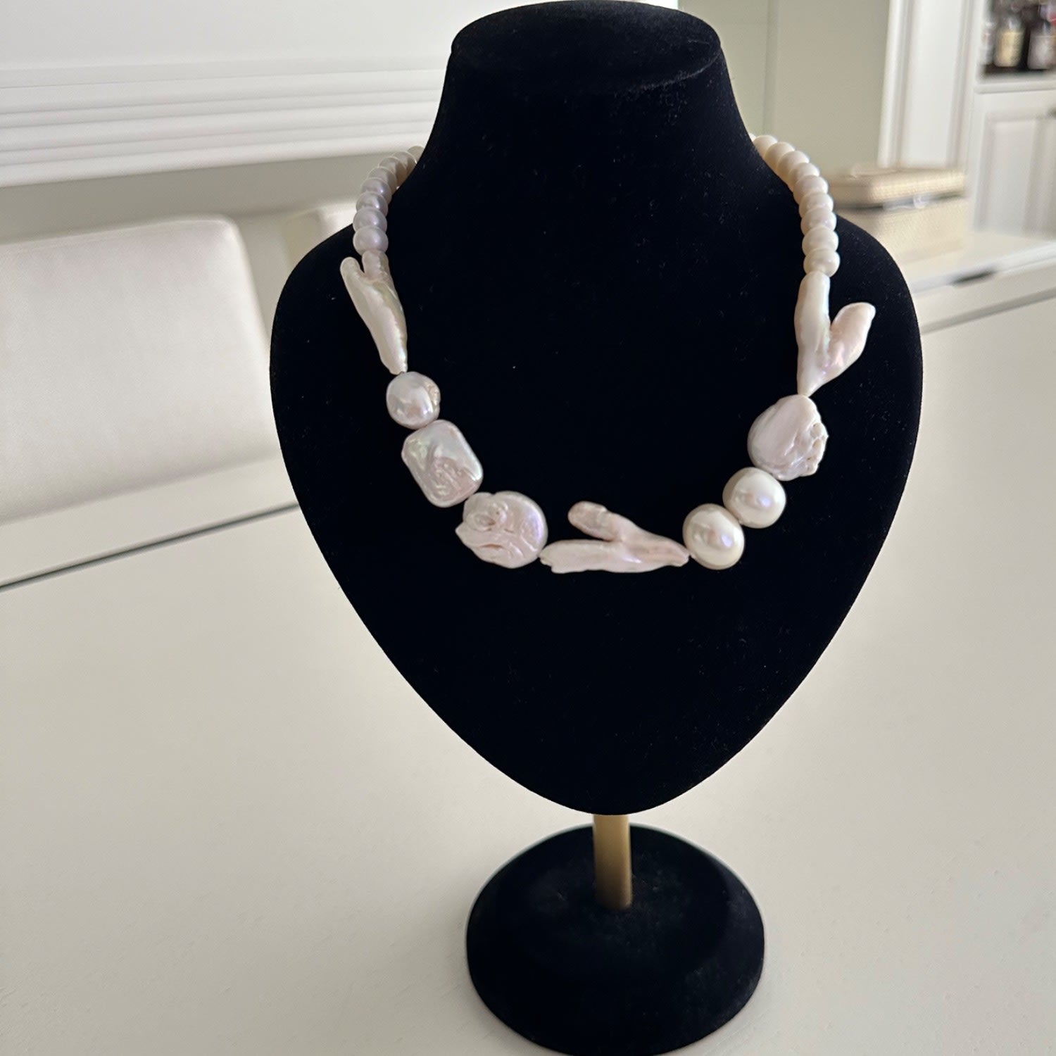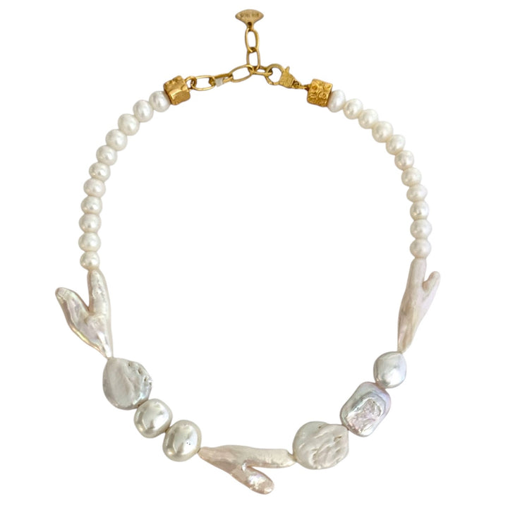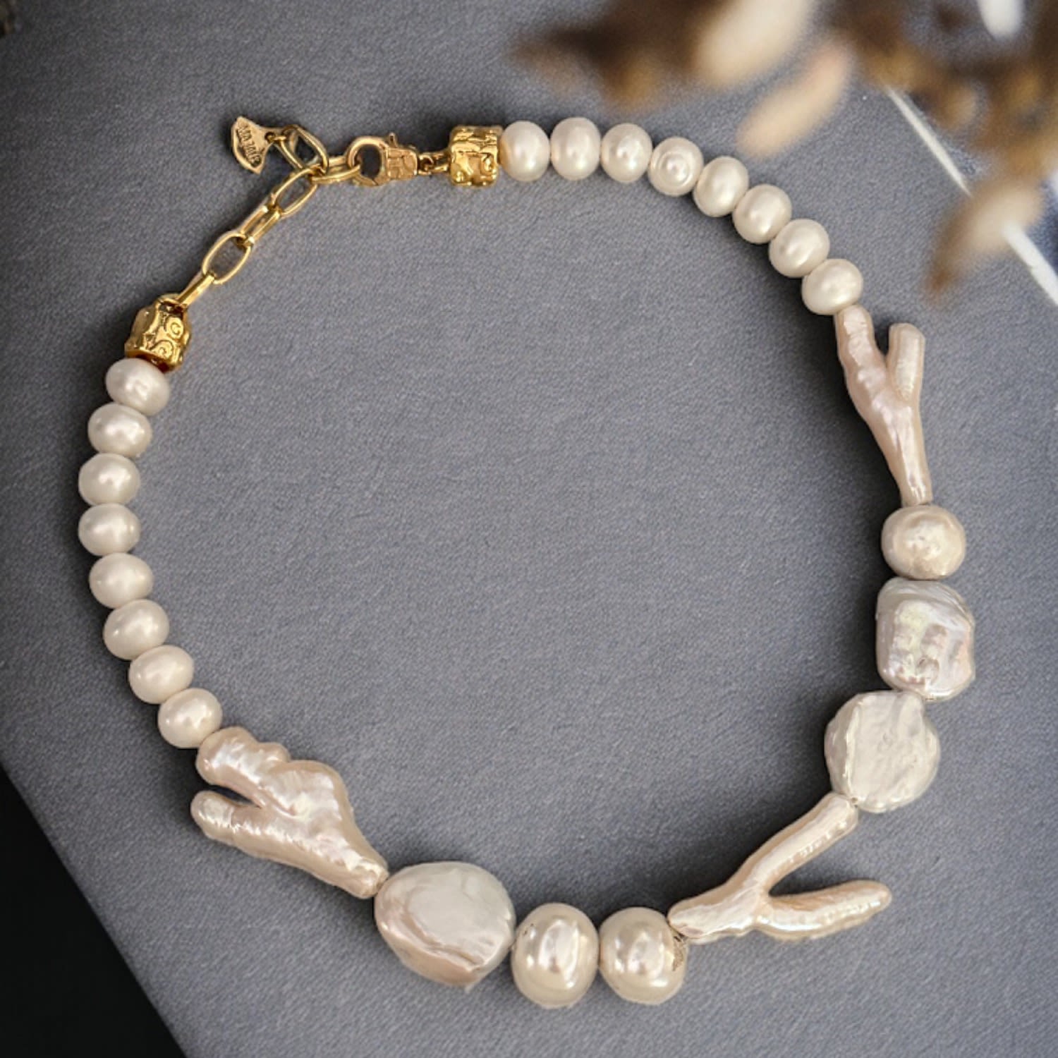 This necklace is handcrafted with 100% pearls and gold-plated materials.