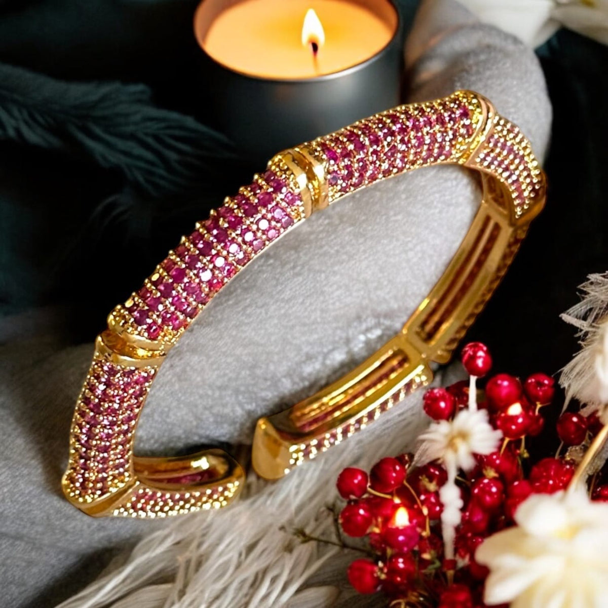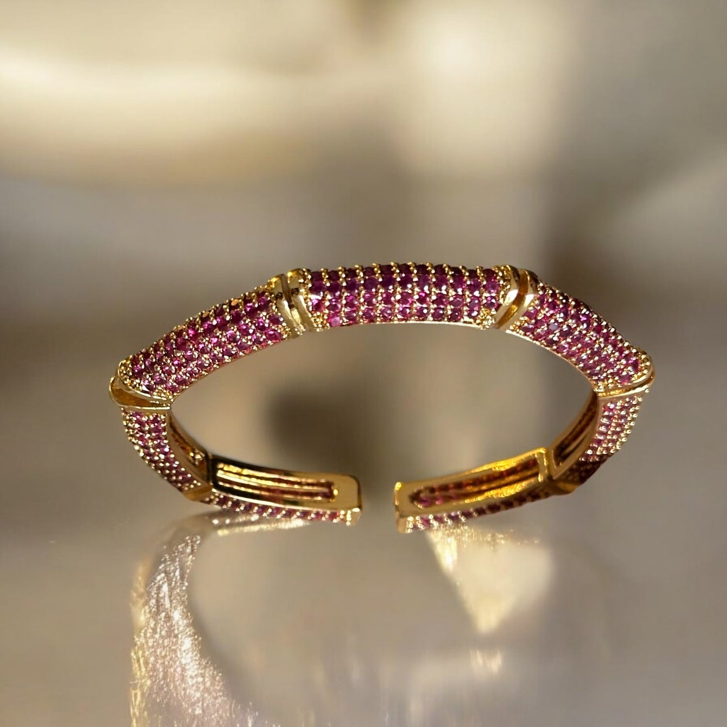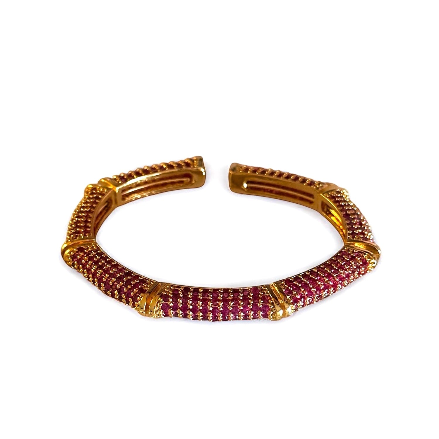 This Shine Cuff Red Bracelet by Majalis Jewelry is a unique, handcrafted cuff bracelet produced in limited quantities. The bracelet features 24K gold plating on bronze and is adorned with sparkling red zircon stones. This piece is a bold and luxurious statement accessory.