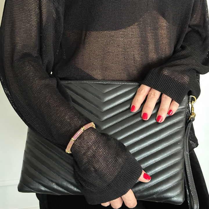 This cuff bracelet is handcrafted from bronze with 24K gold plating and features zircon stones.