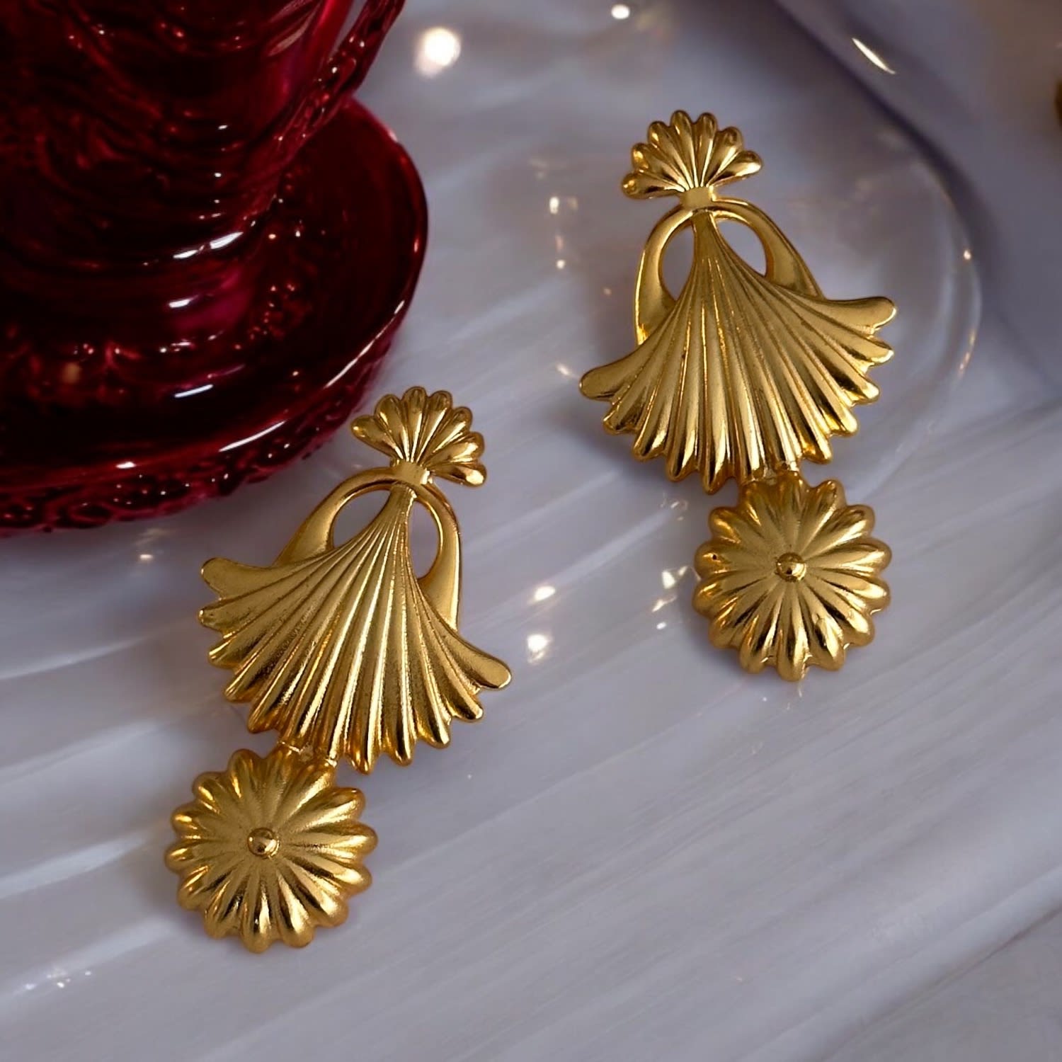 These dangle earrings are handcrafted from bronze with 24K gold plating.