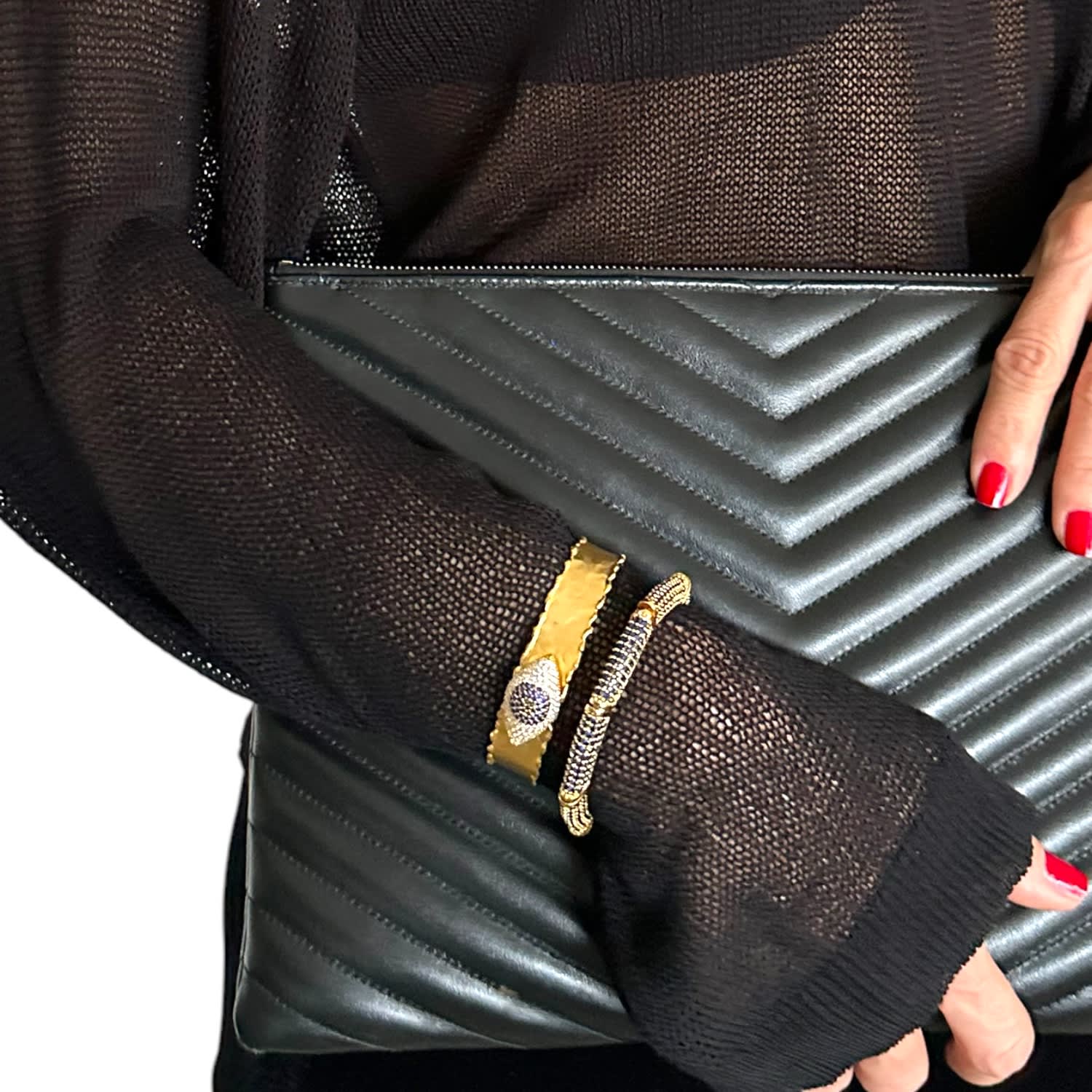 This handmade cuff bracelet is crafted from bronze with 24k gold plating and zircon stones. It was produced in limited quantities.