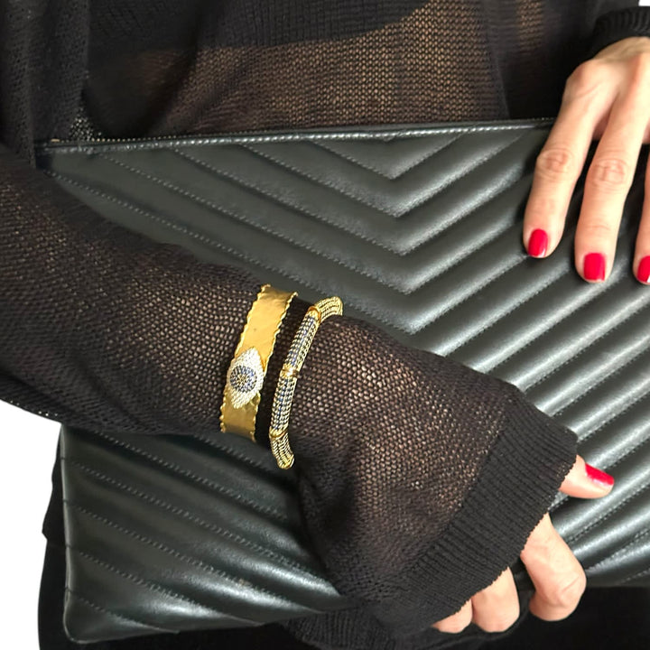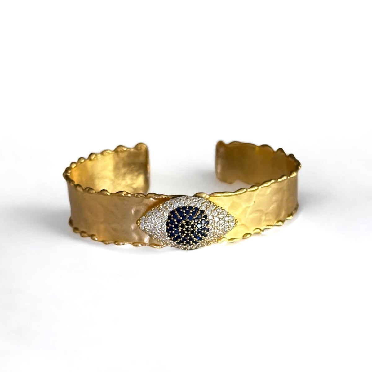 This Ema Evil Eye Bracelet by Majalis Jewelry is a handcrafted and unique accessory. This cuff bracelet features a 24k gold plating and zircon stones on bronze. It also has a unique evil eye design, making it a special piece that highlights your elegance.