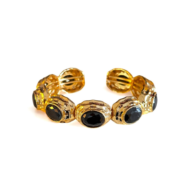 This Black Handcuff Gold Bracelet by Majalis Jewelry is a modern and timeless accessory. Produced in limited quantities by hand, this cuff bracelet features 24-carat gold plating and a natural stone on bronze. It is a special piece that highlights your elegance.