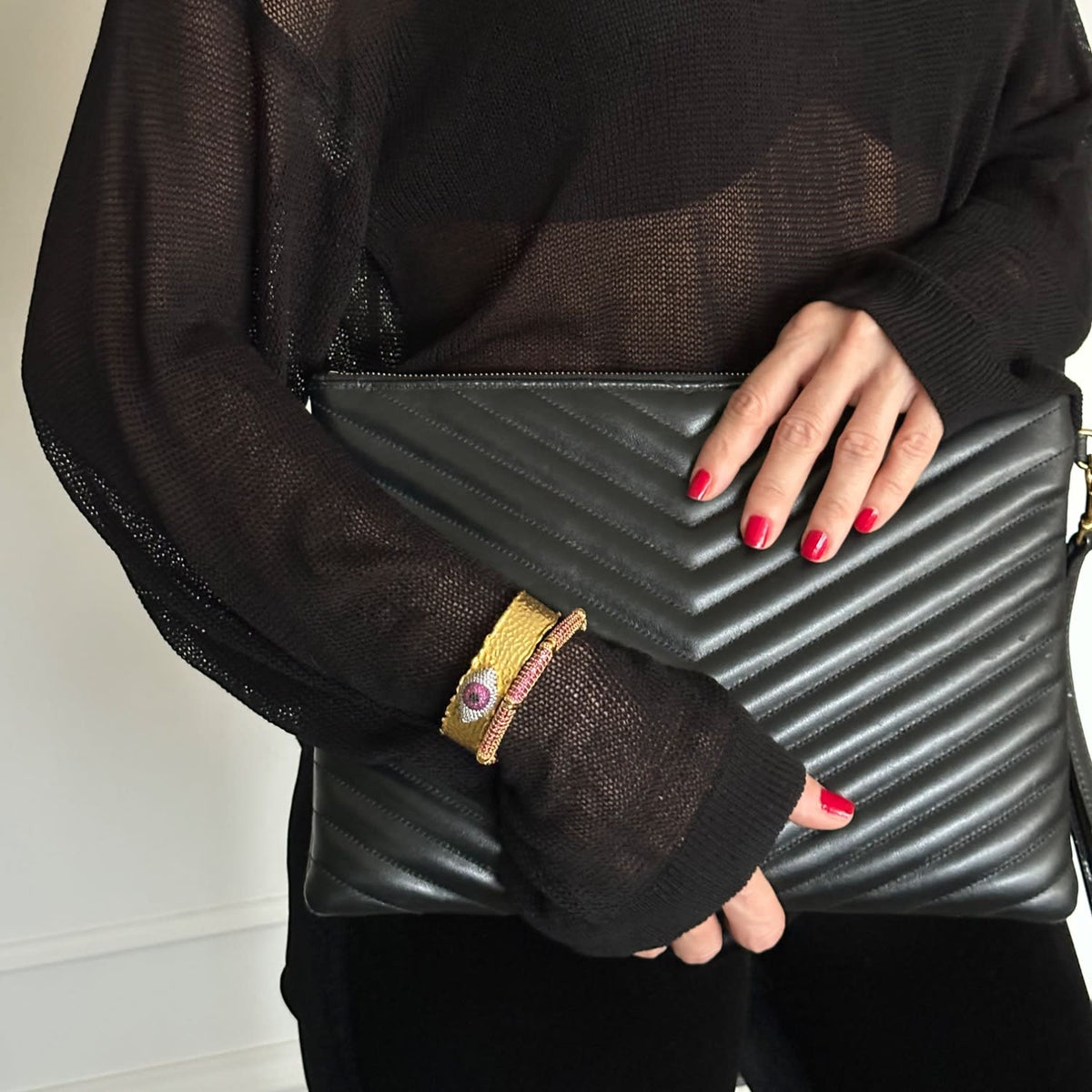 This handcrafted bracelet is made of bronze with 24K gold plating and features zircon stones. It is made in limited quantities. Avoid contact with chemicals, perfumes, creams, and water.