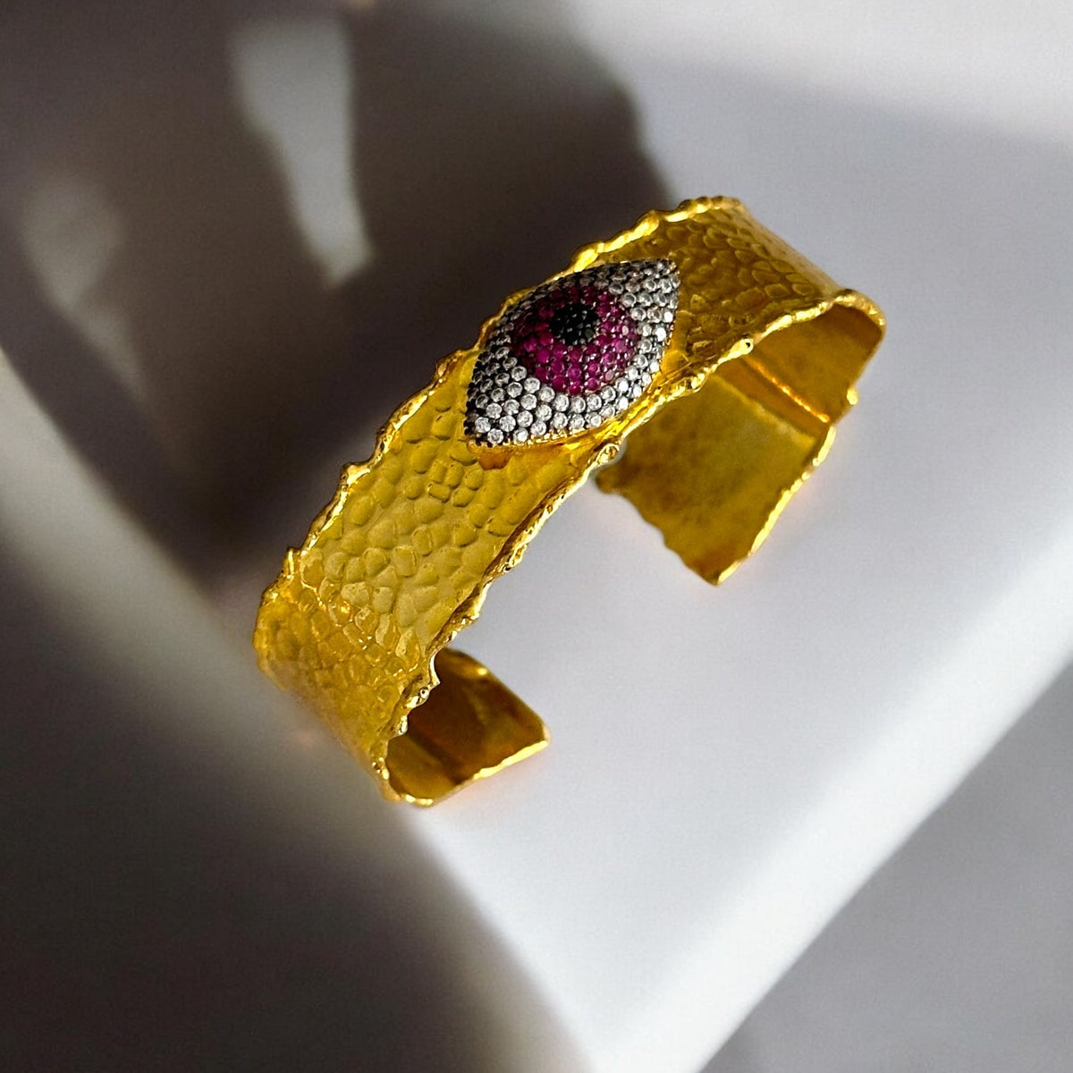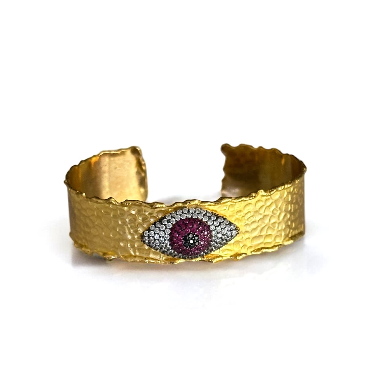 This Evil Eye Gold Zircon Bracelet by Majalis Jewelry is a modern and timeless piece with a classic protective symbol. The evil eye motif, crafted with 24K gold plating and sparkling zircon stones, highlights your elegance while offering a sense of peace and security. Handcrafted in limited quantities, this bracelet is a special and unique accessory for women who feel both unique and free.