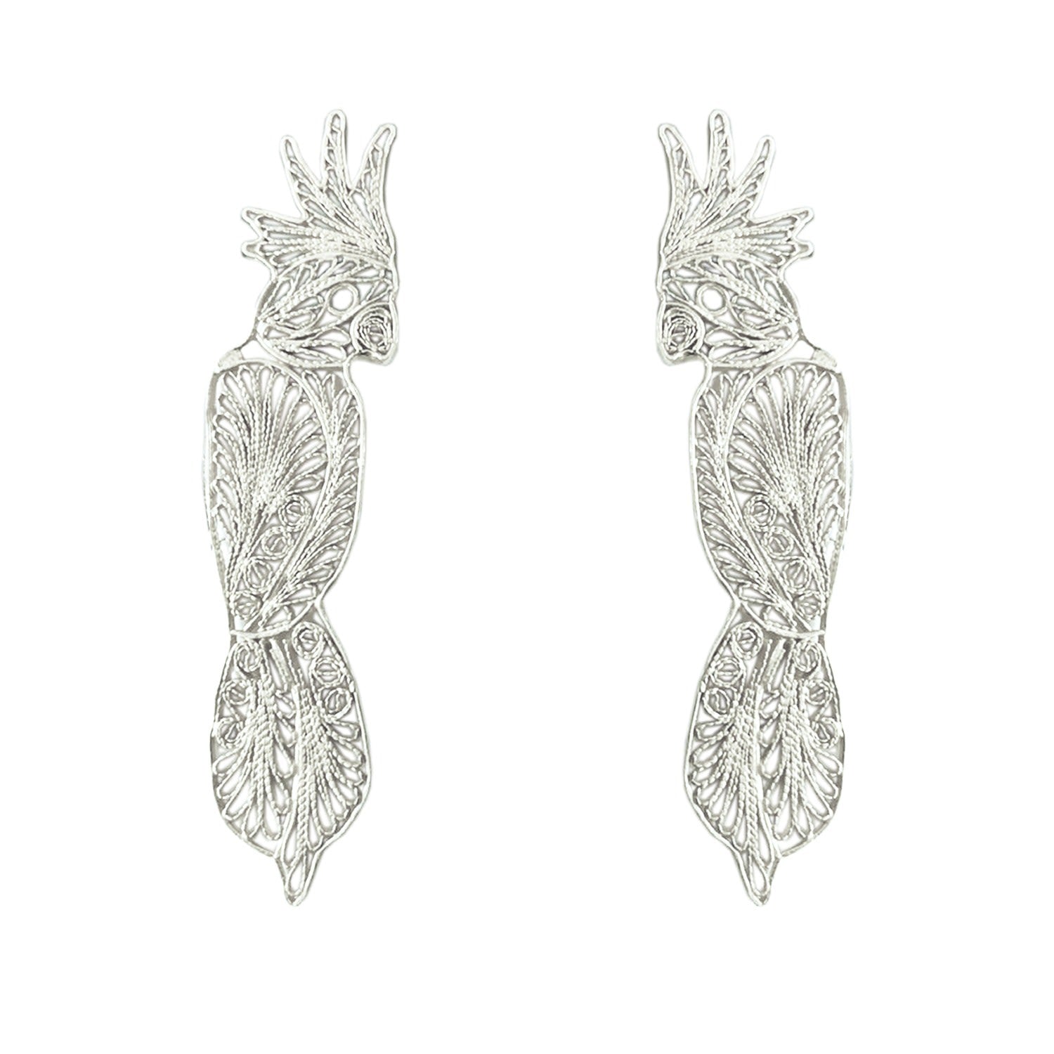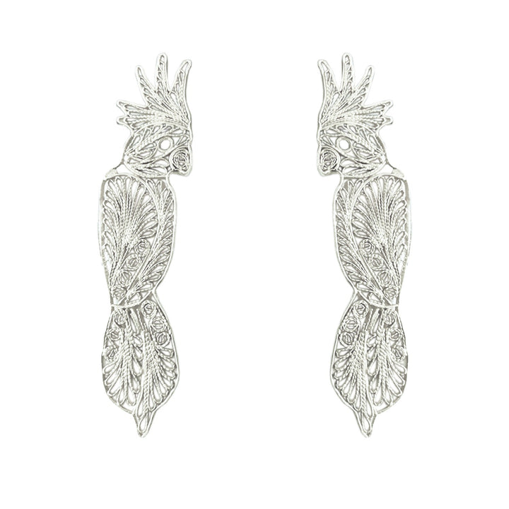 These Tropicalia Silver Cockatoo by Mamba are a beautiful piece from a collection inspired by the exotic birds of the Yucatan Peninsula. Each handmade earring has slight variations, adding to its unique charm and showcasing the artisanal magic of its production. These earrings are a celebration of nature's beauty and the artistry of human hands.