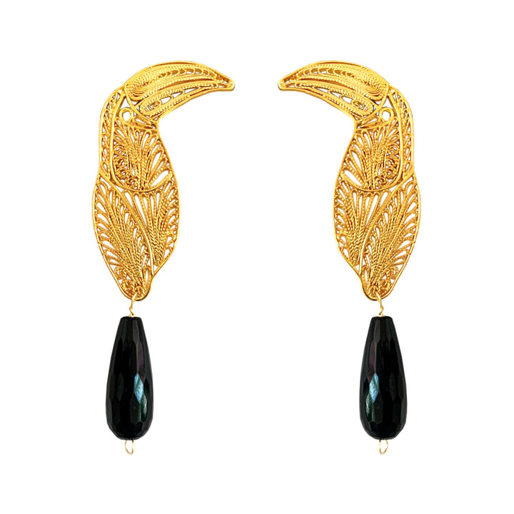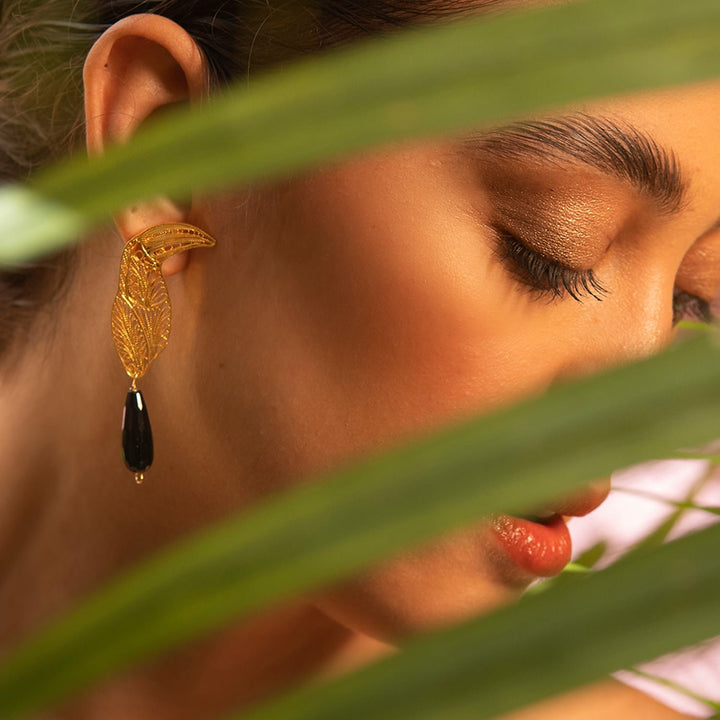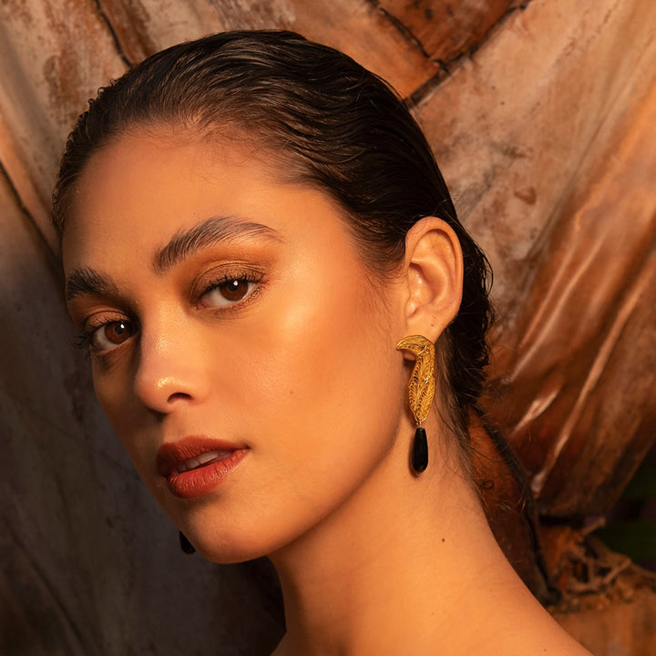 These Tropicalia Golden Toucan With Black Agate by Mamba are a beautiful piece from the Tropicalia collection, which celebrates the birds of the Yucatan Peninsula. The golden toucan, with its black agate detail, is a whimsical and artistic accessory. As a handmade product, each earring is subtly unique, capturing the magic of artisanal production.