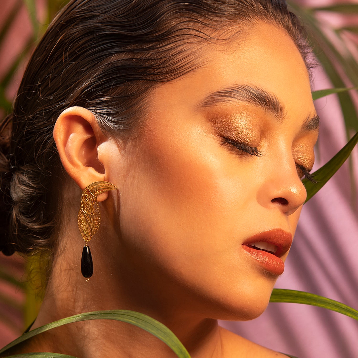 These earrings are a handmade product, crafted from golden metal with a black agate stone.