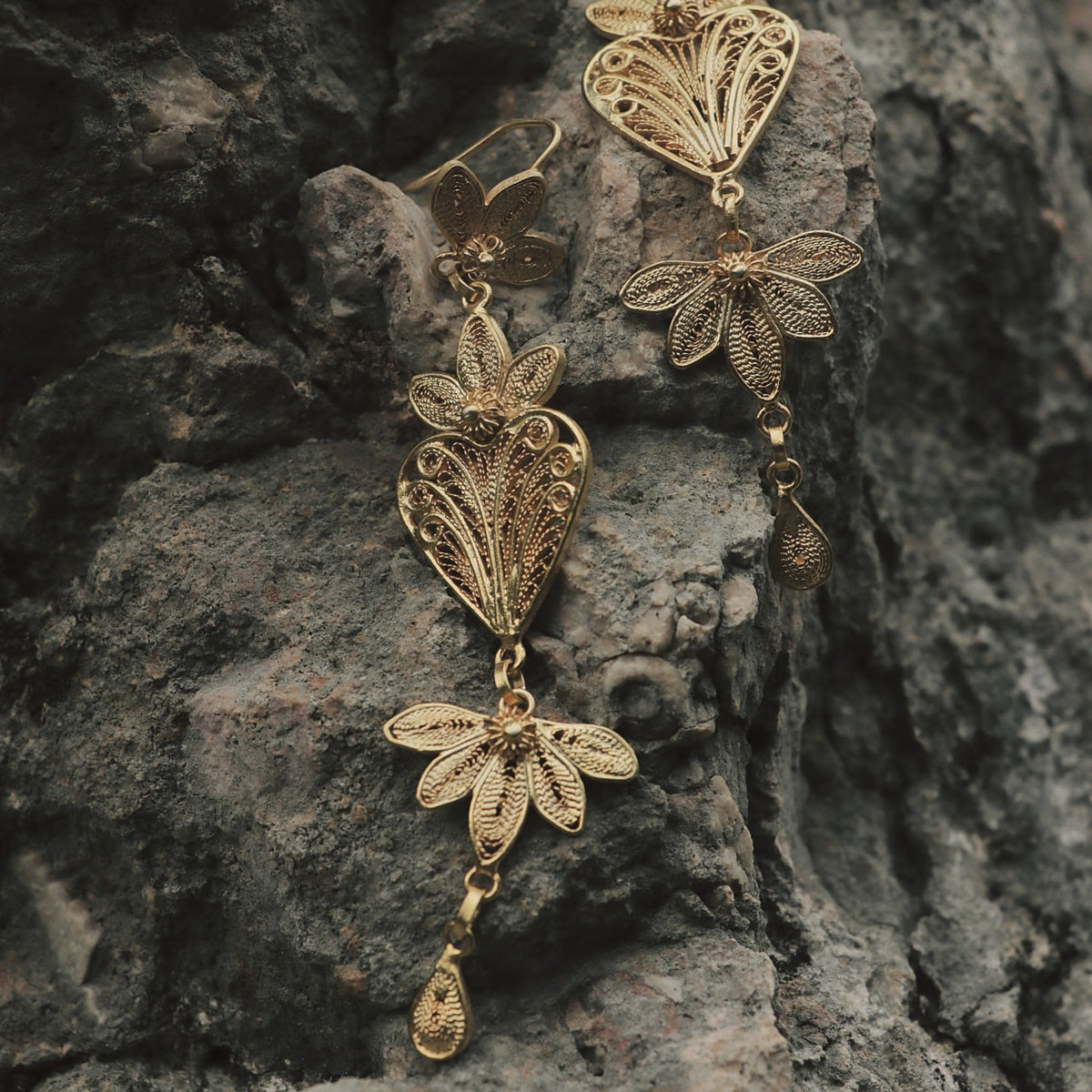 These handmade chandelier earrings are crafted from silver and represent flames and rays.