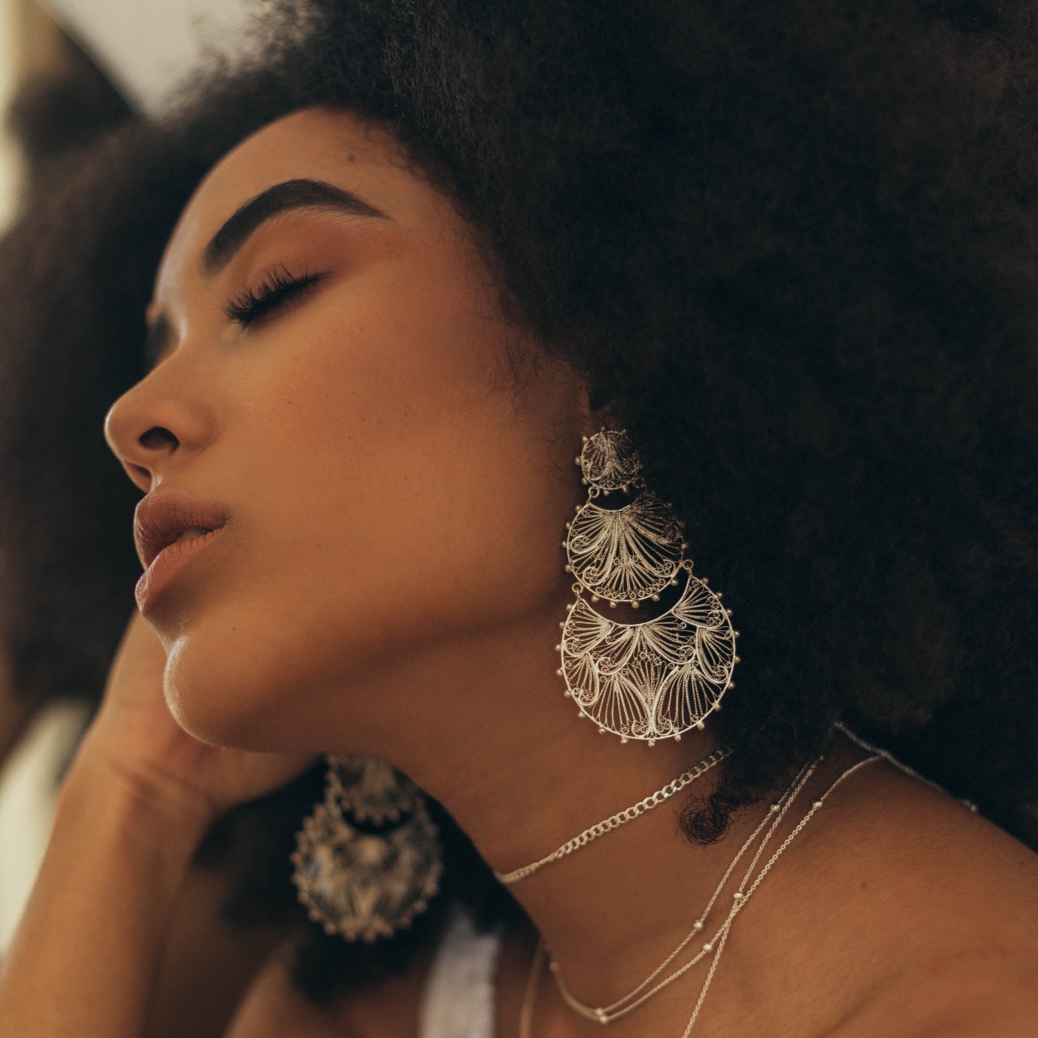 These Alma Statement Earrings by Mamba are a testament to finding beauty in the unconventional. Part of the "ALMA" collection, they are about returning to our center, reuniting with ourselves, and appreciating the simple things that give us happiness. The unique, handcrafted design speaks to the simple things that bring joy. These pieces are a bold statement that are a celebration of individuality and the "magic of MAMBA and its artisan production."