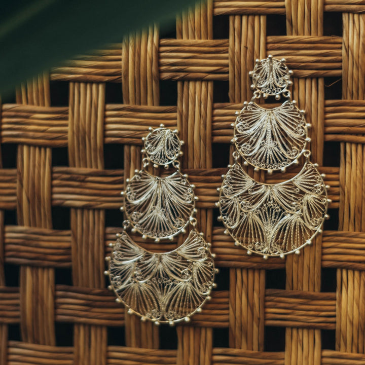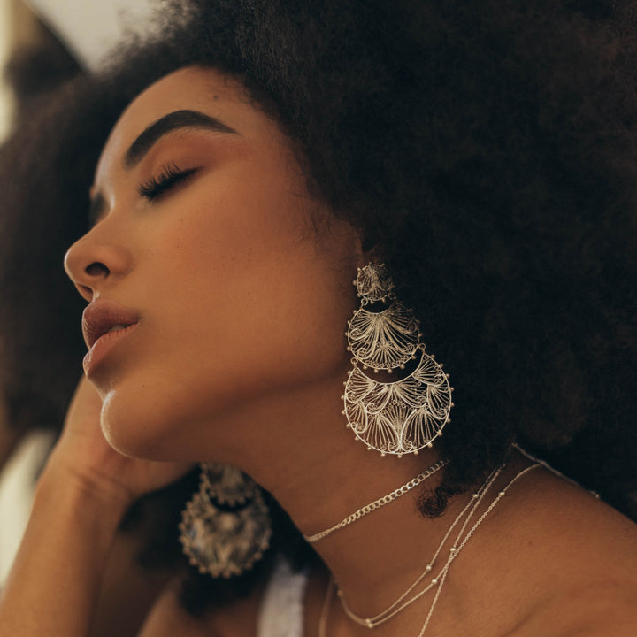 These handmade earrings are part of the Alma collection and are crafted from silver. To clean, use sodium bicarbonate, water, and a fine brush. Store in a place isolated from the environment.