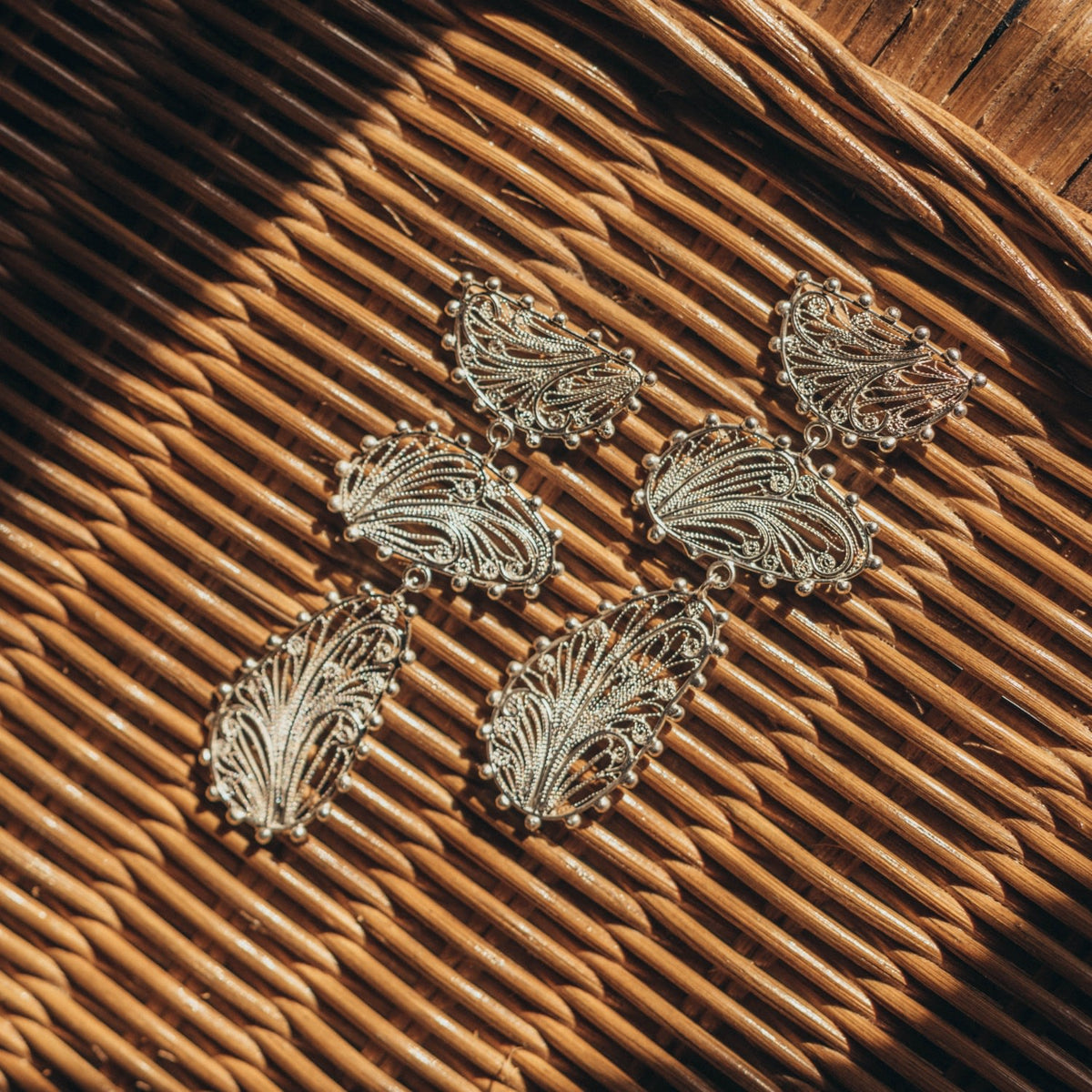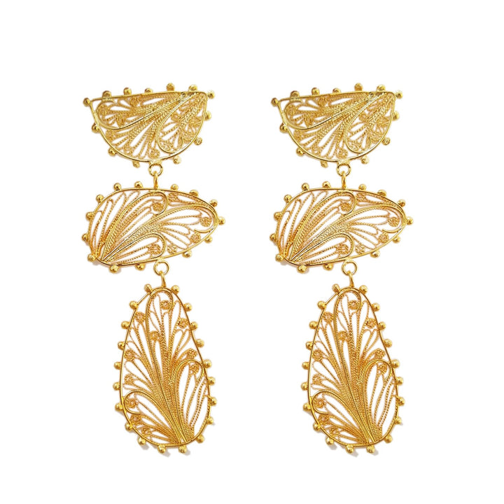 These handmade earrings are part of the Alma collection and are crafted from silver with a golden finish. To clean, use sodium bicarbonate, water, and a fine brush. Store in a place isolated from the environment.
